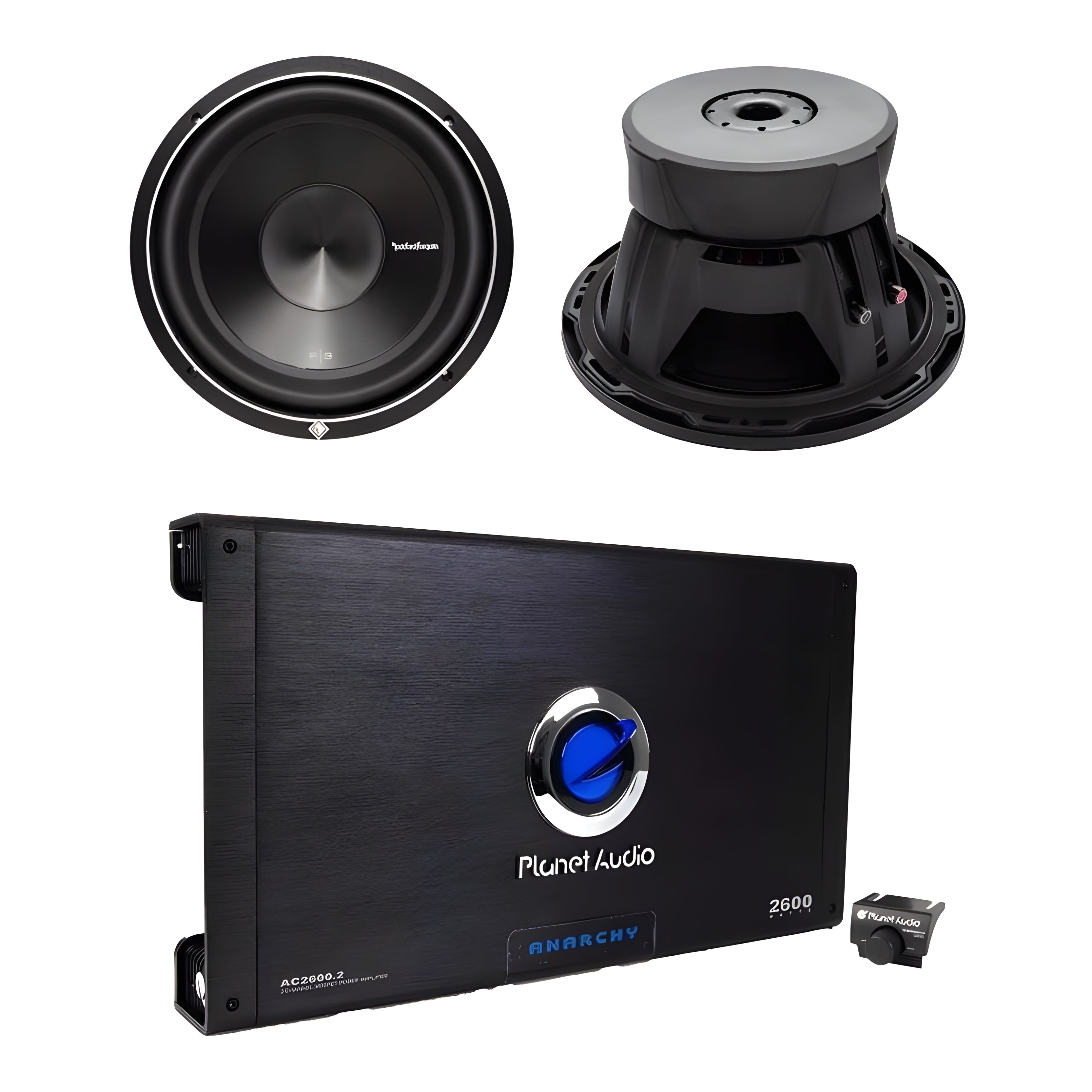 A: The package includes two Rockford Fosgate P3D2-10 10-inch, 1,000-watt 2-ohm car subwoofers and a 2,600-watt 2-channel amplifier.