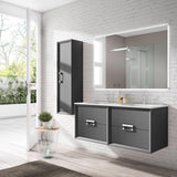 A: A spacious, wall-mounted double vanity available in White, Black, Gray, or White with Silver accents, designed for modern bathrooms needing extra storage and a sleek, stylish look.