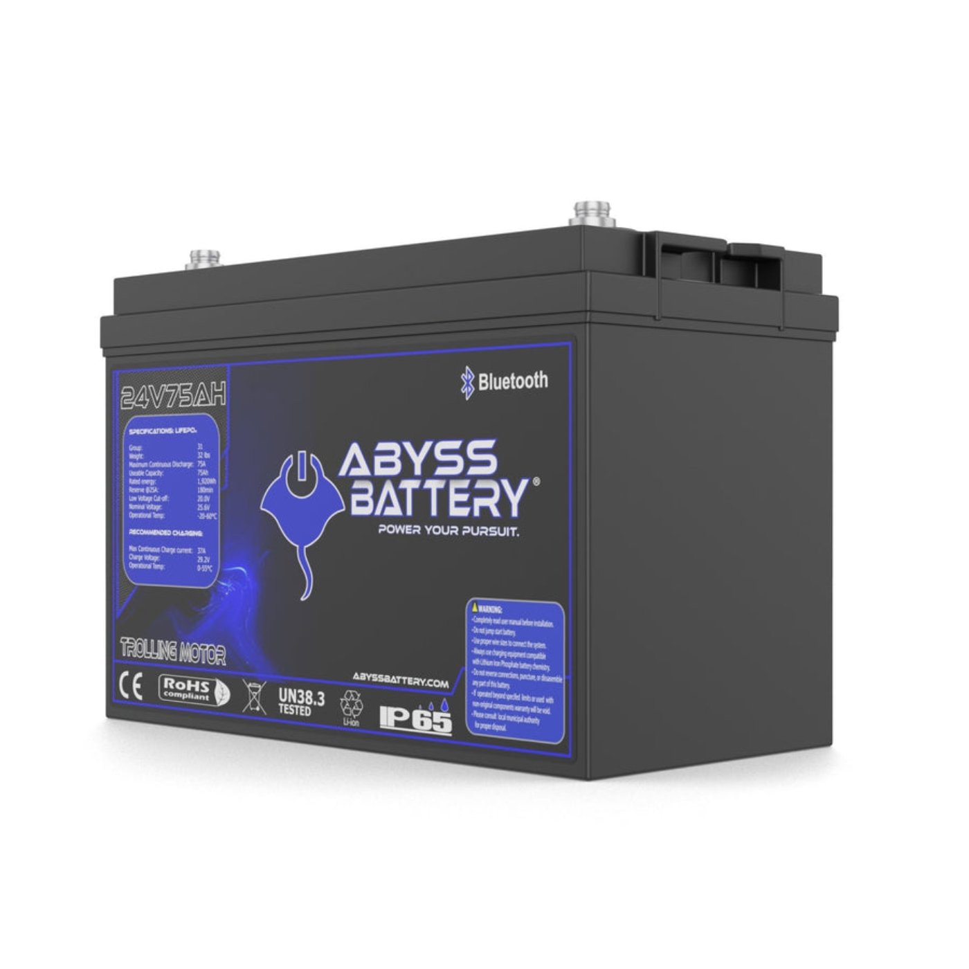 Swap your unreliable trolling batteries for a powerful ABYSS® 24V 75Ah Lithium Trolling Motor Battery. This single group 31 battery is compact, lightweight, and frees up storage space by replacing two 12-Volt Lead-Acid or AGM group 31 batteries in series.
