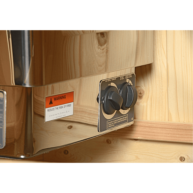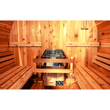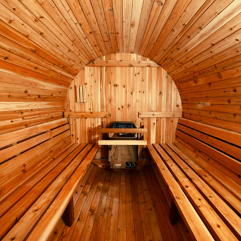 Almost Heaven’s Princeton Sauna has the largest interior of their barrel sauna rooms, measuring 6’x8’ with opposite-facing benches, this sauna has enough space to let you stretch out or invite some friends over. The Harvia 8kW electric heater fires the room up to 195ºF in an hour, and you can choose from three different sustainably sourced sauna woods: White Fir, Clear Cedar (no knots are shown), or Rustic Cedar (knots are visible).