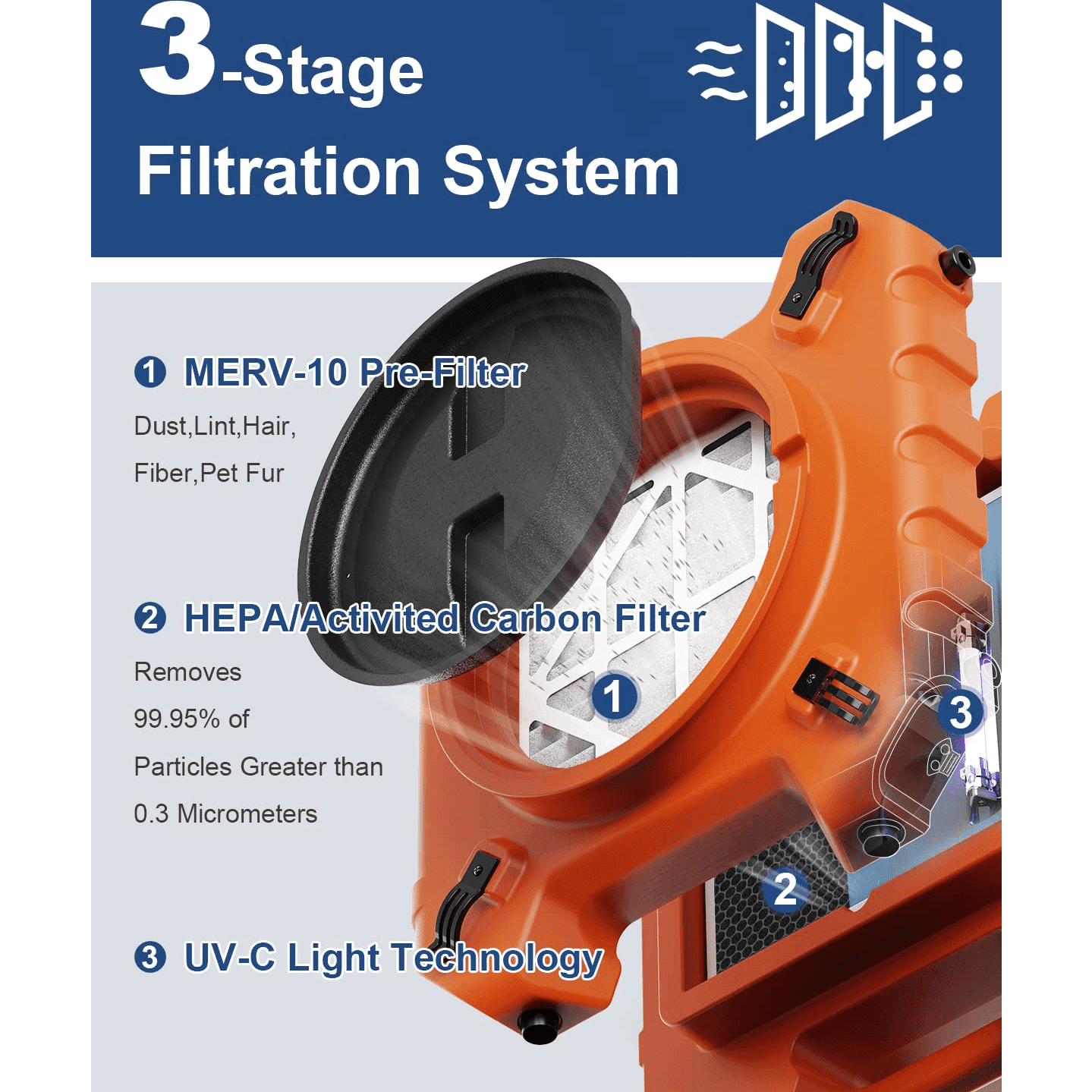 The motor features greater stability, improved efficiency, and a longer lifespan. The portable air scrubber and negative pressure machine have a 16-inch air intake, unlike any competitor's units. The Airflow is up to 750 CFM. This way, you can be certain the entire room is benefiting from cleaner air.
