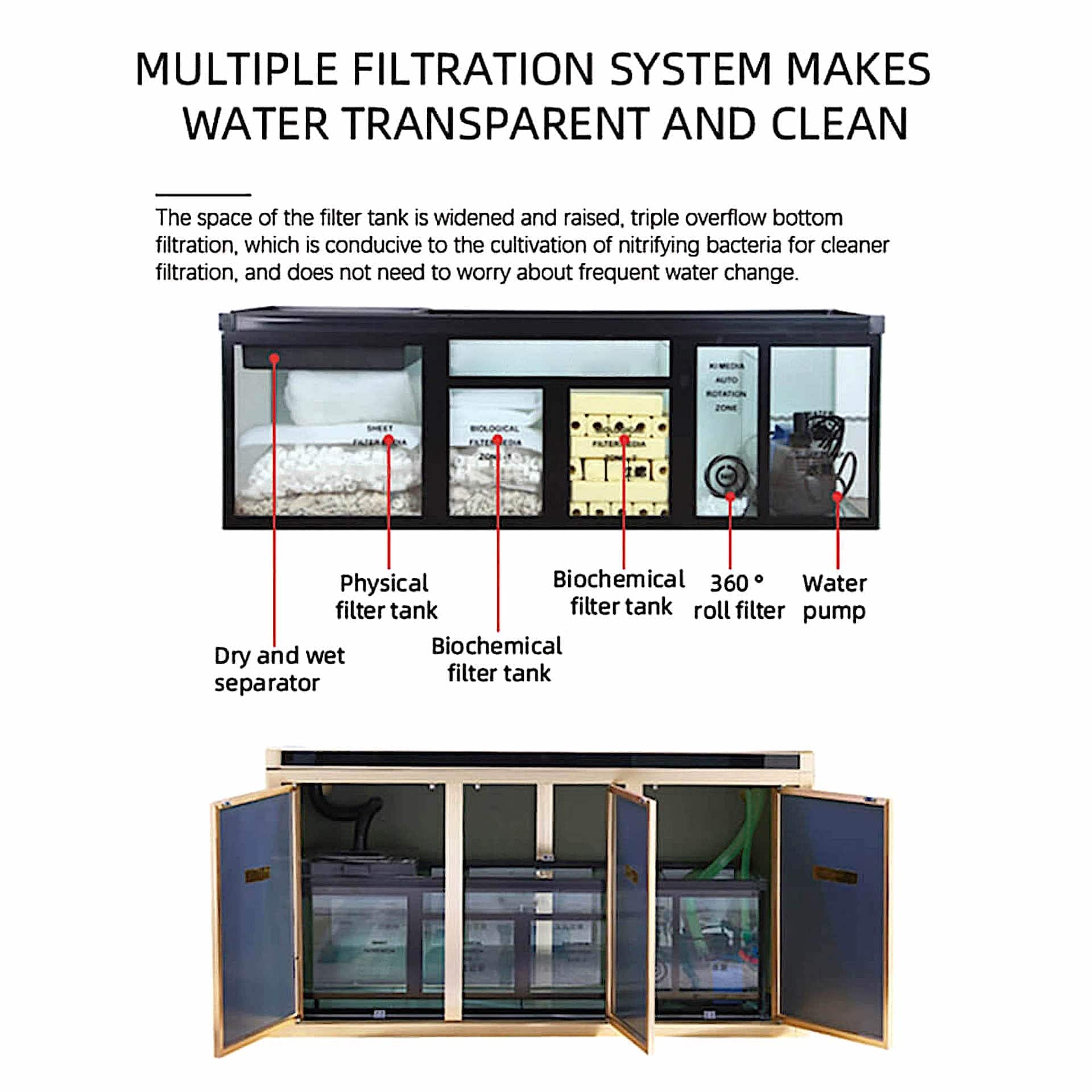 The premium aluminum frame prevents deformation and fading and also comes with a tri-color LED-equipped cover. The cabinet frame is also resistant to tension and torque deformation which can be caused by heavy loads as well as being corrosion resistant. The cabinet houses the sump filtration system, which will include all the pieces needed for installation, as well as a submersible aquatic pump. The sump filtration system includes a wet-dry filtration system as well as designated filter media dividers. This will allow for a modular approach when handling the filter media of your choice.