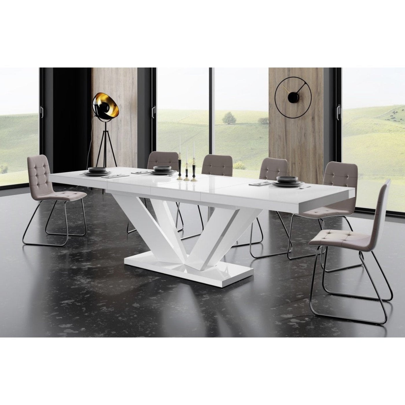 The original legs in the shape of the letter V and a modern high gloss table top make AVIVA 2 Dining table and chairs a stylish and sophisticated accent of your dining/living room. In addition to its modern design, the table also features a practical folding function. You can easily get 81.9 inch or even 100.8 inch from the standard length of 63 inch.