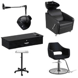 A: The package typically includes an adjustable styling chair, a shampoo station, a full-length styling mirror, and a storage-friendly workstation, ensuring all the essentials for a salon setup.