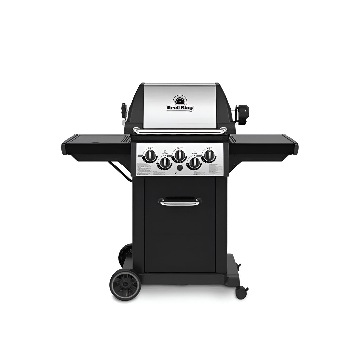 The Monarch 390 features 330 sq. in. primary cooking surface and includes 3 stainless steel Dual-Tube™ burners, reversible heavy-duty cast iron cooking grids, stainless steel Flav-R-Wave™ cooking system, and electronic ignition. The Monarch™ 390 features painted steel drop-down side shelves and enclosed cabinet base.