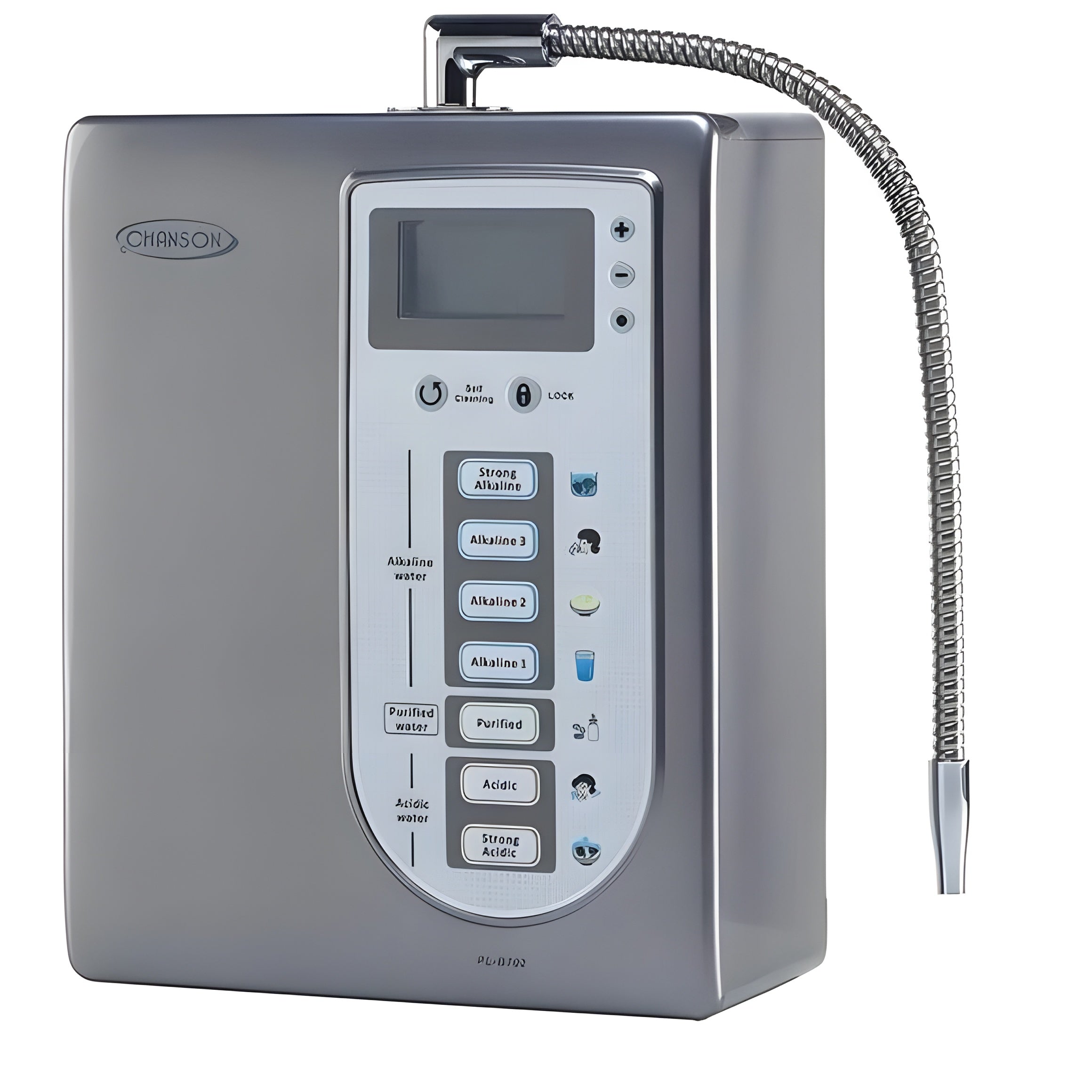 Auto-Adjust Function: Chanson Water Ionizers can be fine-tuned for YOUR source water quality! Water supply can vary greatly from state to state and county to county. Because of the difference in source water, an ionizer at the same electrolysis settings will produce different pH levels, a filter in a different water quality condition will have different filter life, and the self-clean function in different water quality conditions will have different frequencies of self-cleaning cycles. The Chanson water ionizer can auto-adjust "the remaining water filter life" and "time of self-clean" according to your water quality. You will have your own personalized water ionizer settings!
