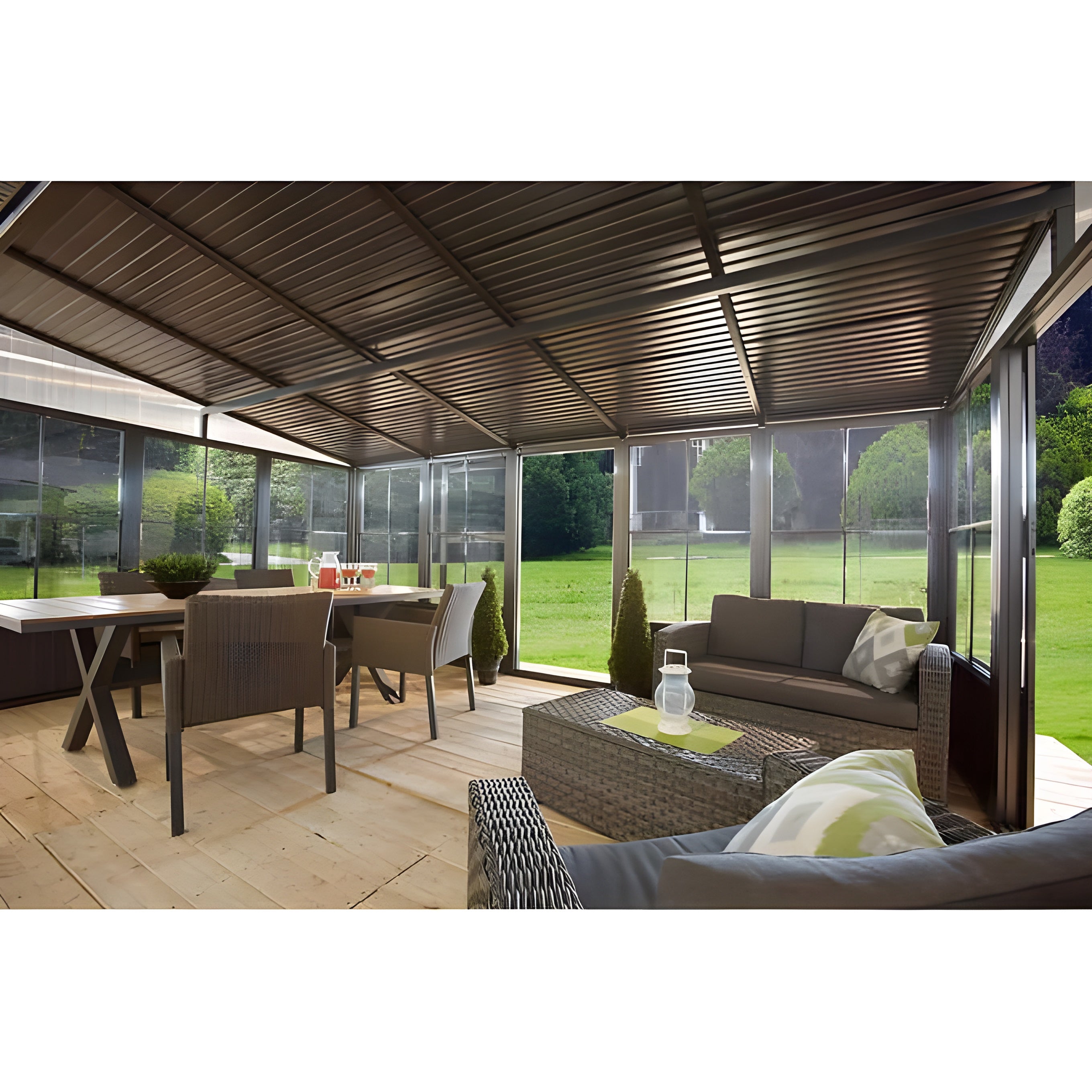 Imagine your own private haven of relaxation where you are protected from snow, rain, mosquitoes, and UV rays all while being surrounded by the beautiful outdoors. It is now possible to enjoy your backyard all year round. This solarium's structure is made of aluminum, which includes a galvanized steel roof, PVC windows, and mosquito screens. It also creates an intimate space that shelters you and your loved ones from the sometimes harsh and unpredictable elements. This structure will last you for years, creating a beautiful focal point while adding value to your property.