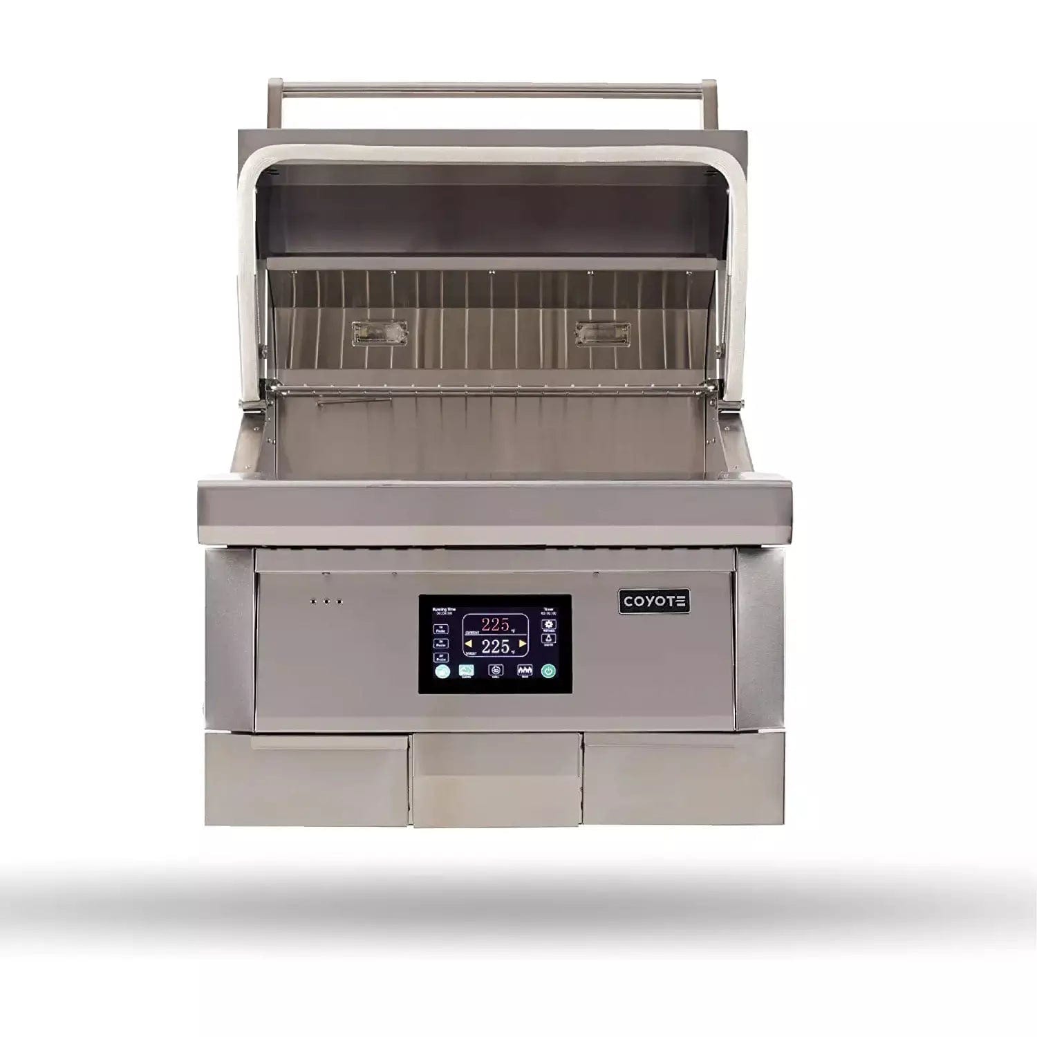 The C1P28 28" Pellet Grill by Coyote is made from durable and long lasting 304 stainless steel. The grill features digital touch controls, a spring assisted hood, 3-in-1 versa rack and smart drop technology.