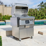 A: The Coyote C1P28-FS is a 28" pellet grill paired with a convenient freestanding cart, offering versatile wood-fired cooking and portability for outdoor kitchens.