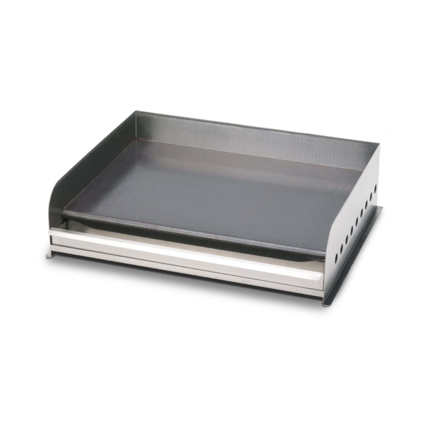 Transform your Crown Verity barbeque into an outdoor griddle in no time with the Crown Verity Removable Griddle. Perfect for making pancakes, frying eggs, and cooking sausages, this griddle attachment let’s you add more variety to your menu and is great for special events or even the occasional breakfast service since it can be easily removed and your grill transformed back into a charbroiler. This removable griddle is constructed out of 0.31-inch thick cold rolled steel and comes equipped with stainless steel splash guards and a removable grease tray. It measures 24 by 23.5 inches with a height of 7.5 inches and is compatible with all 24” or 48" Crown Verity grill models. To install it, simply slide your grill’s roll dome off the tracks, remove your barbeque grates, and replace with this convenient griddle. This item is not stocked. Please be advised that it could take up to a week to process and ship. Please contact us prior to placing your order if you require an item by a certain date.