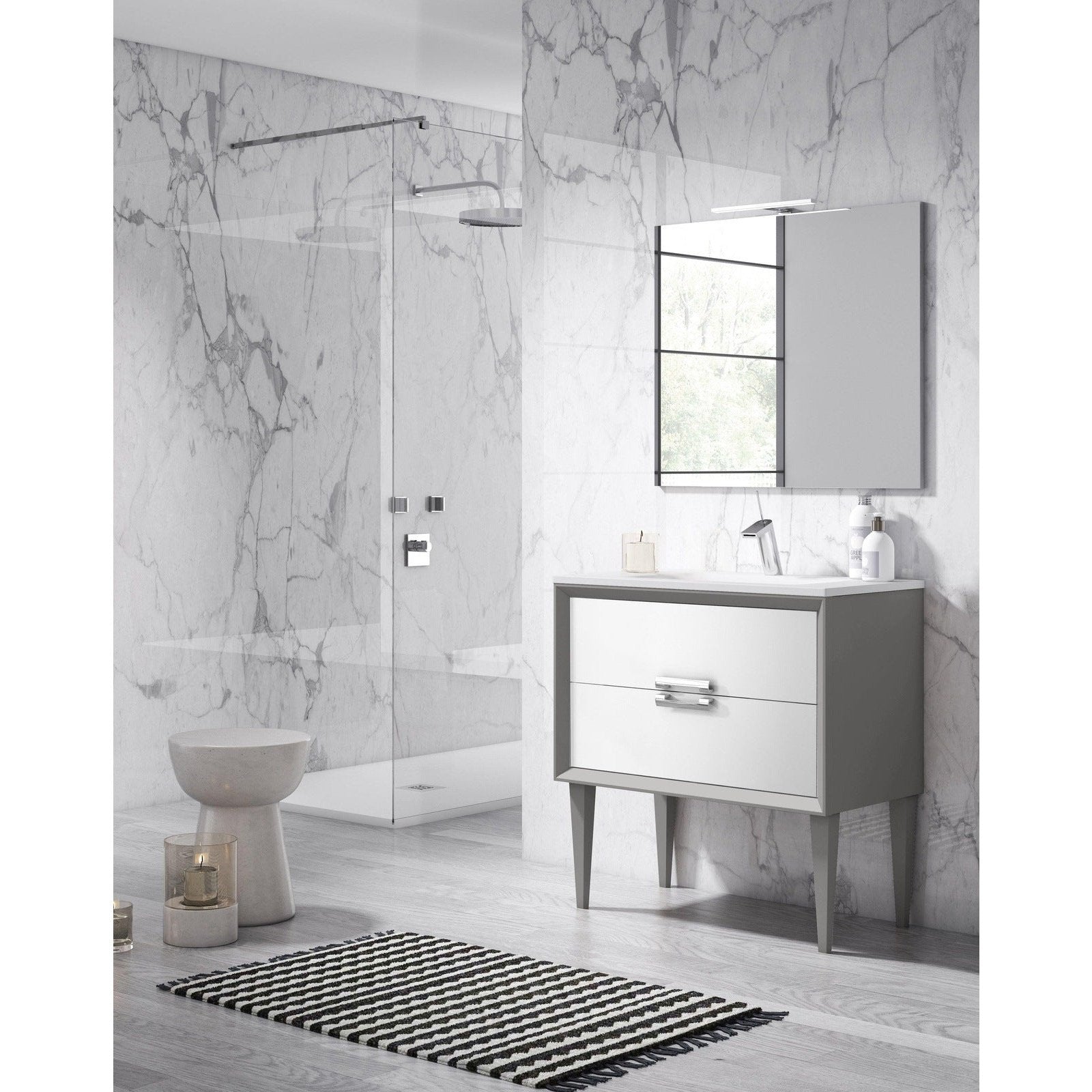 A: The vanity is made from high-quality, durable materials that ensure long-lasting performance while maintaining an elegant appearance. The finishes are designed to resist moisture and wear in a bathroom environment.