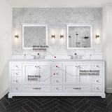 A: The vanity measures 84" in width and 22" in depth, providing generous space for larger bathrooms or double-user setups.