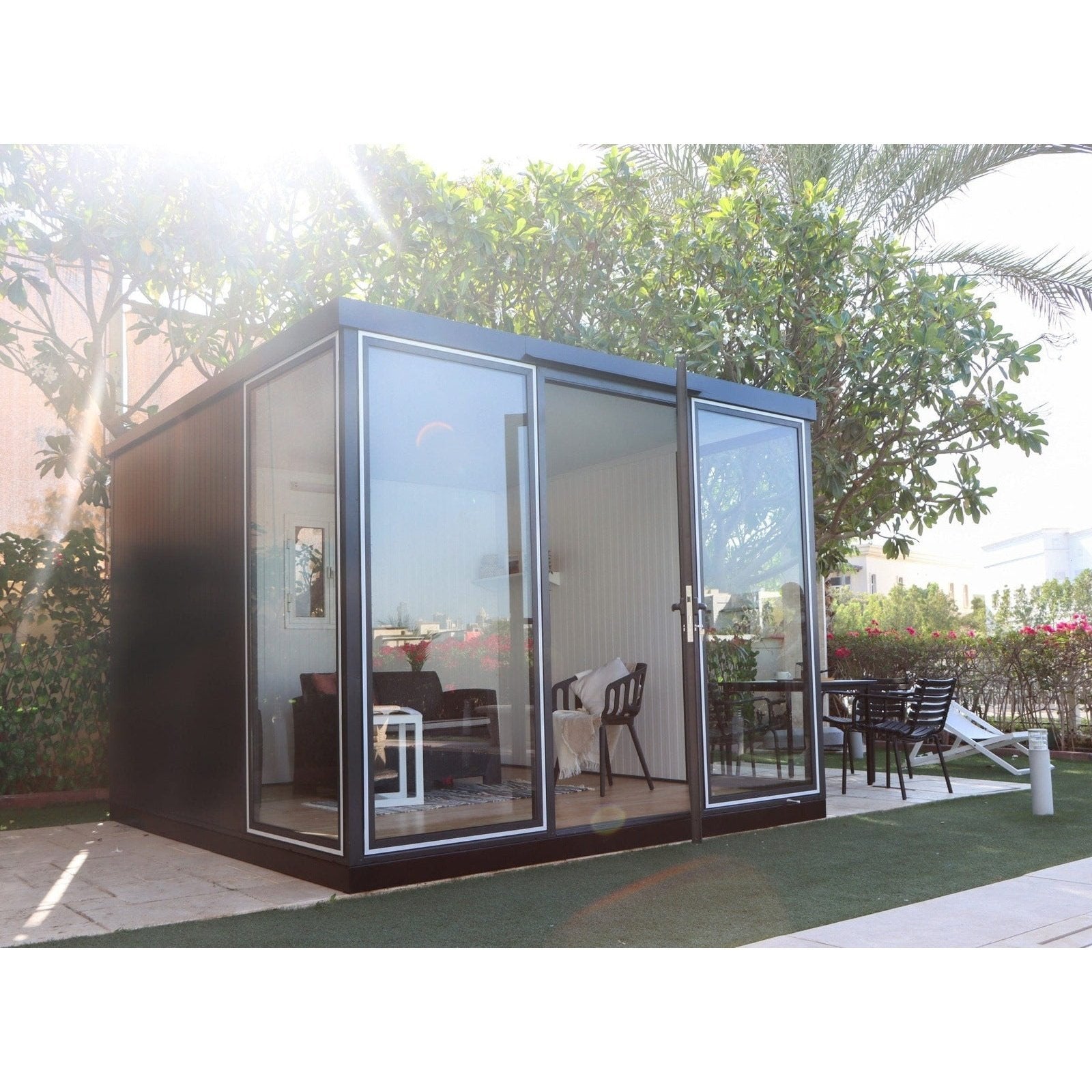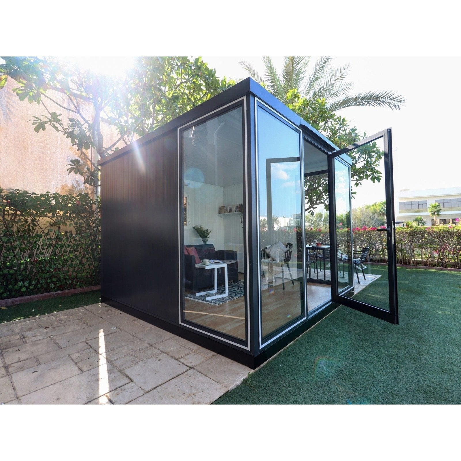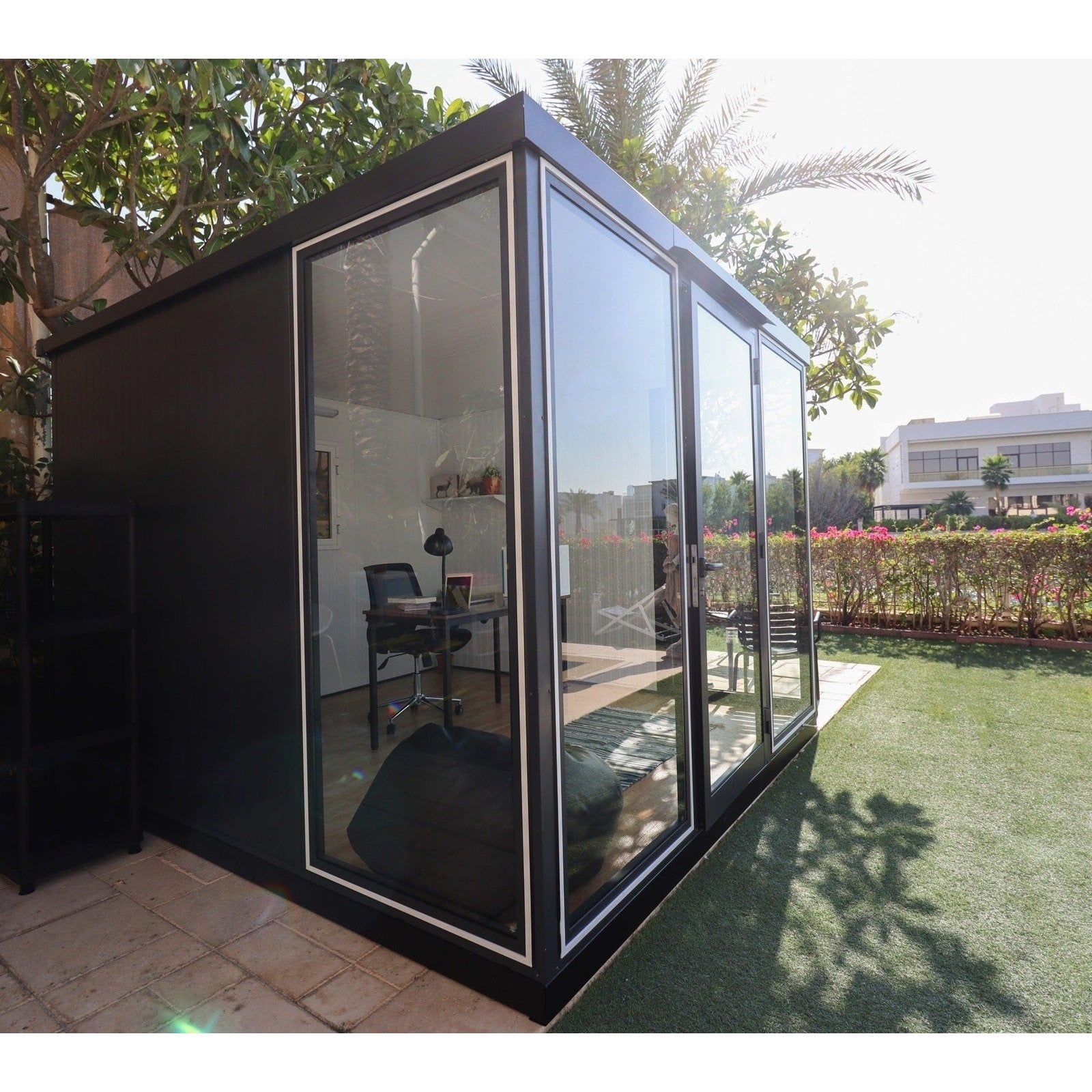 As an office or playroom: it provides a comfortable and stylish space for work or play, away from the distractions and noise of the main house. It is insulated with PU foam sandwiched in between sturdy steel panels, optionally you can add heating and cooled for year-round comfort, making it a great extension of your home.