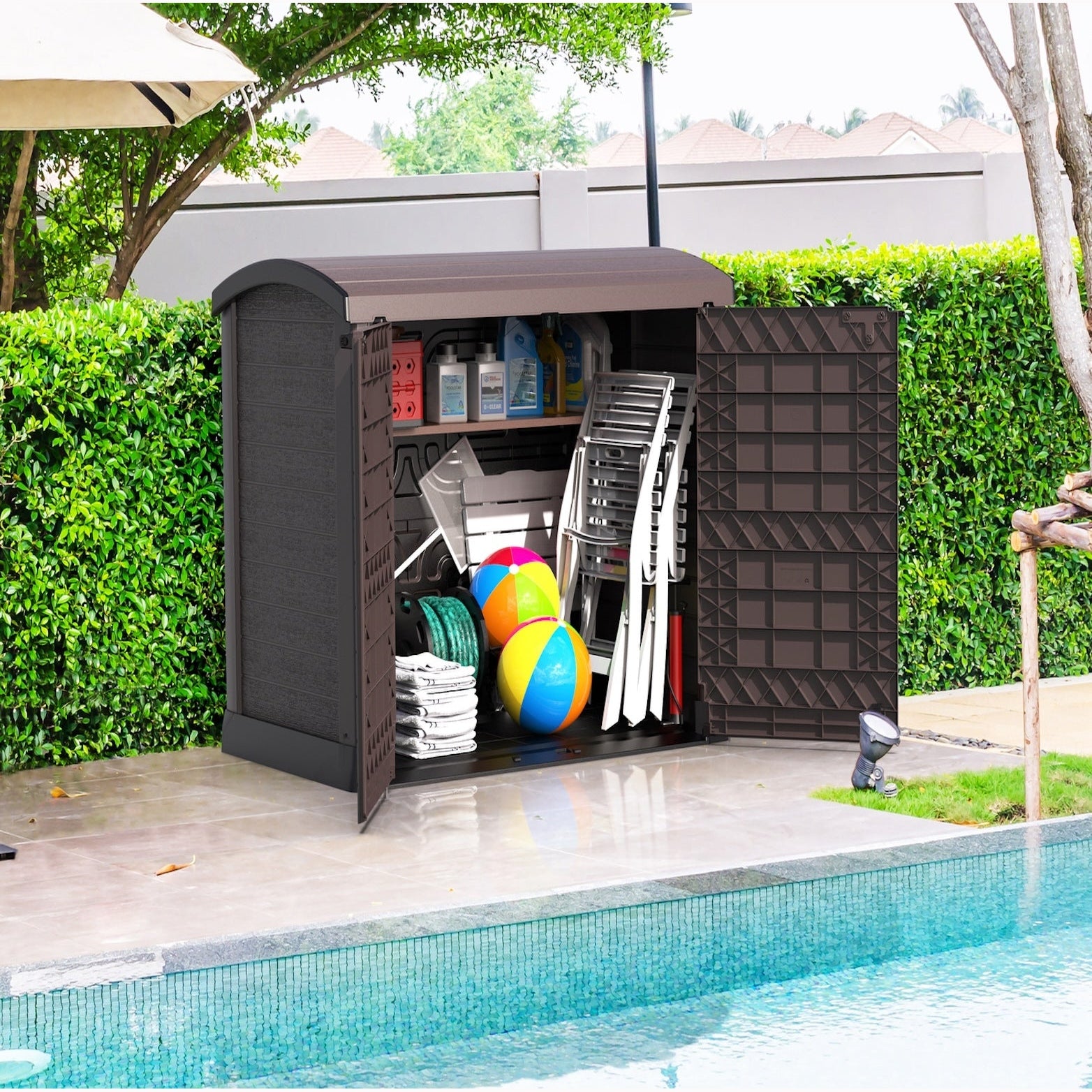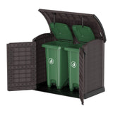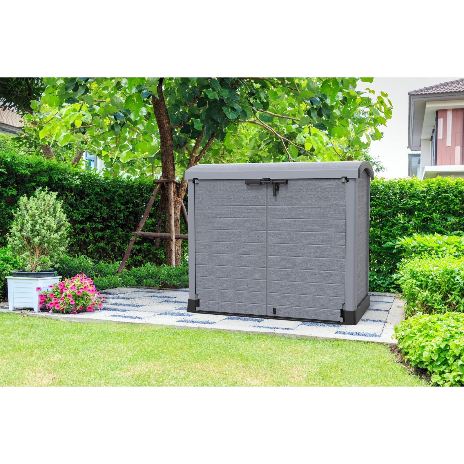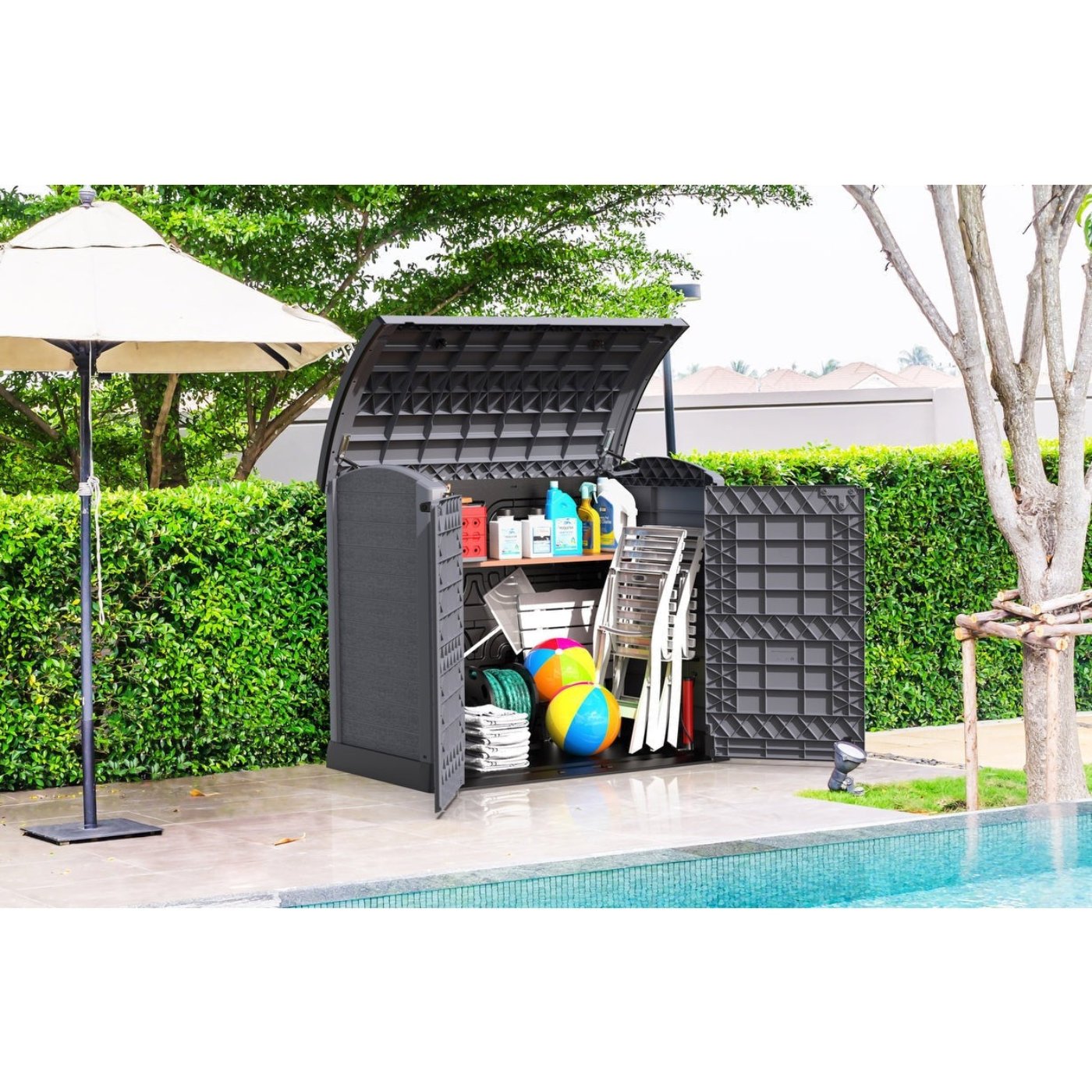 CAPACITY & DIMENSIONS: This outdoor storage shed has a capacity of 120L and measures 57” Wide x 32.5” Deep x 43” Height, a generous dimension completed by wide opening doors and roof for added storage room!