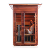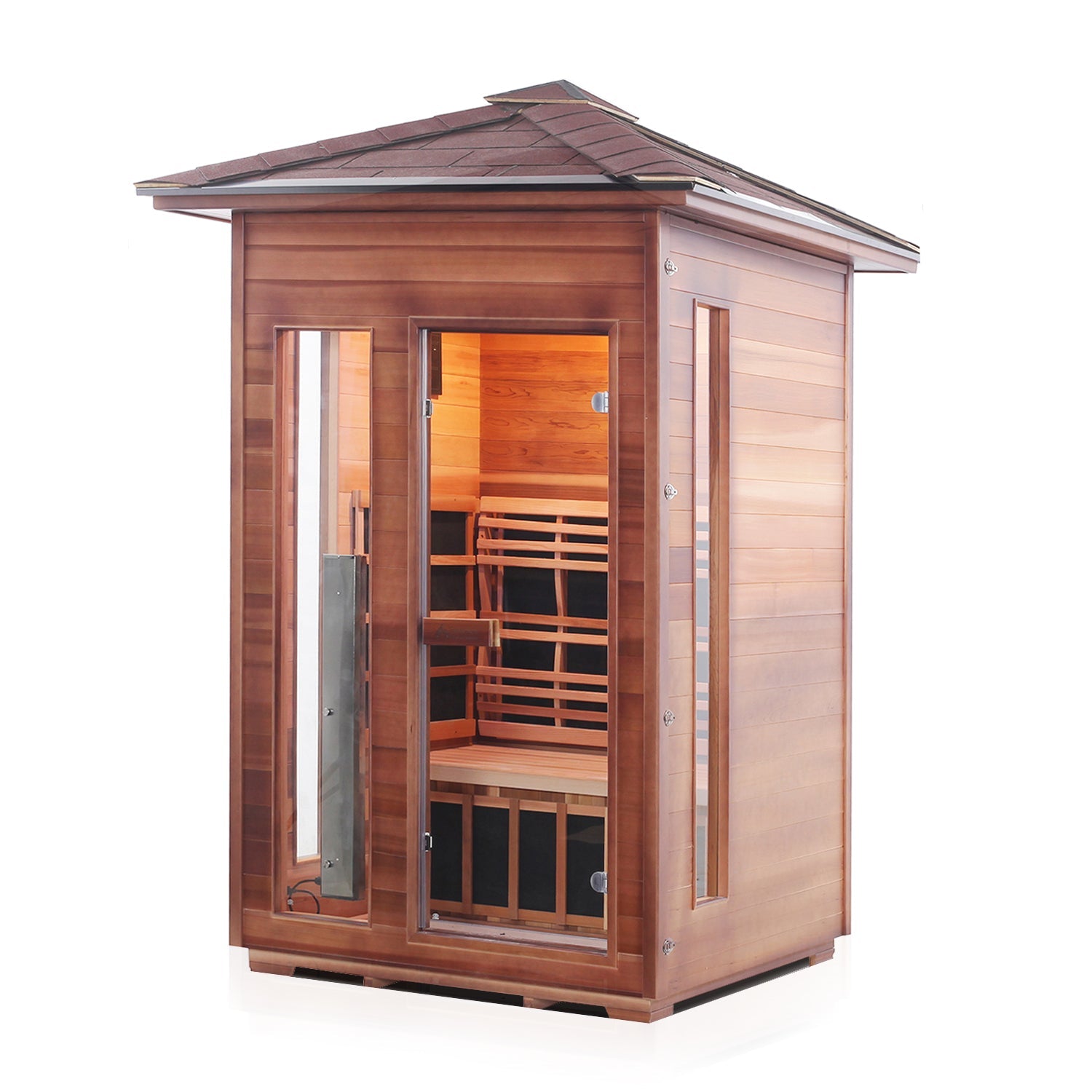 A: The Enlighten Sauna InfraNature Rustic 2-Person Outdoor Sauna is a high-quality infrared sauna designed to comfortably accommodate two people. It combines advanced infrared technology with a rustic outdoor aesthetic, offering a peaceful and therapeutic sauna experience in your backyard or patio.