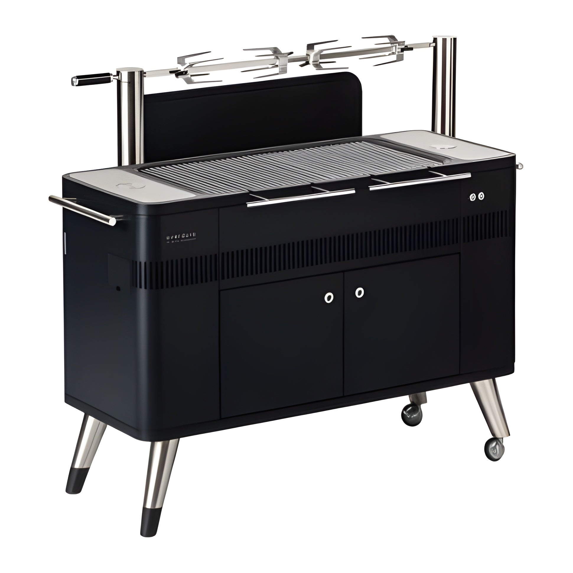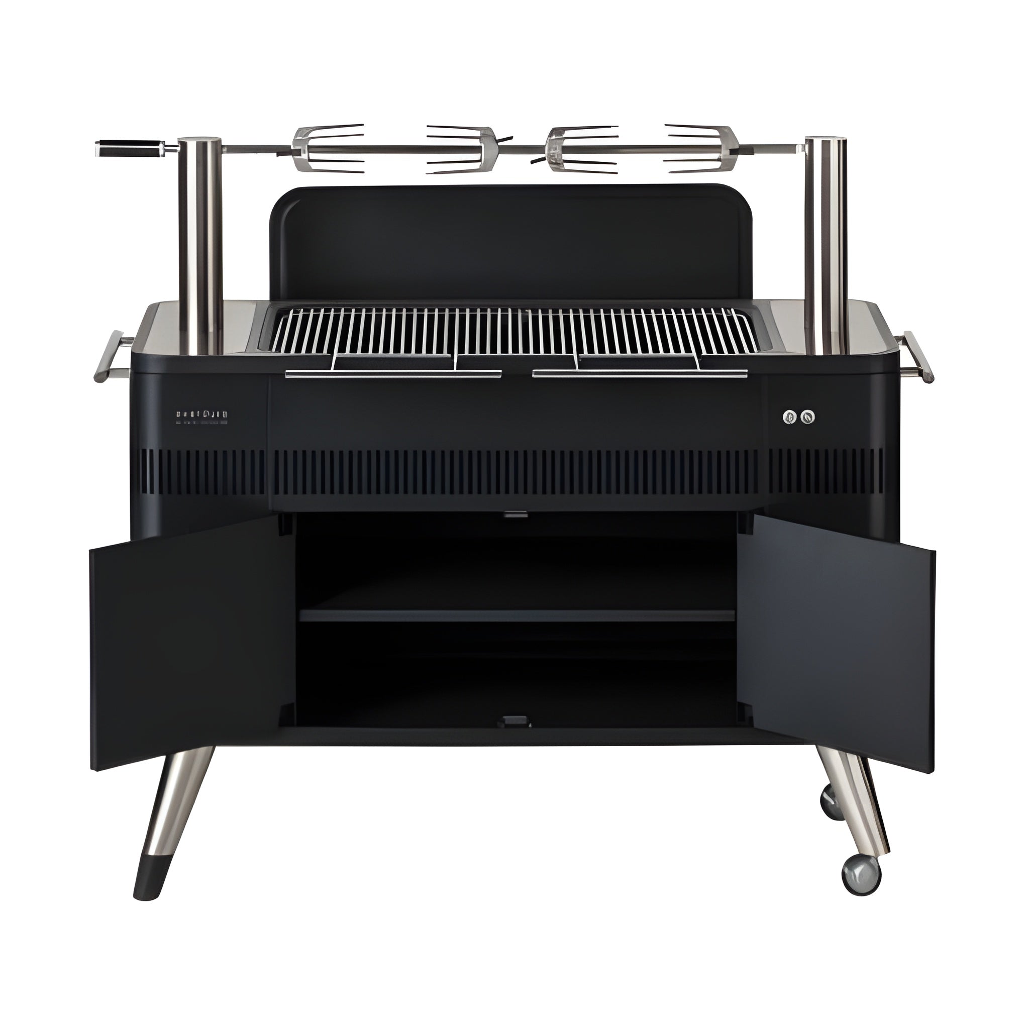 One Touch Rotisserie Pole System: Built-in rotisserie system powered by a discrete motor, with multi-level height adjustment.