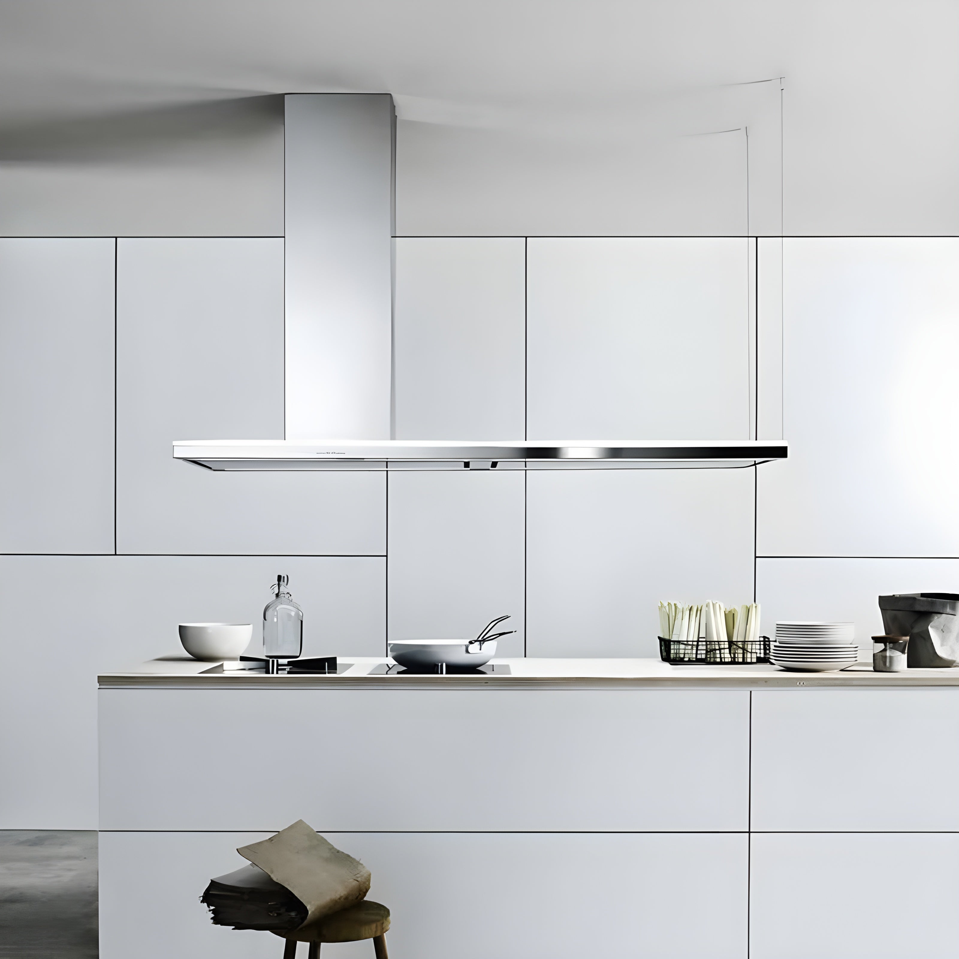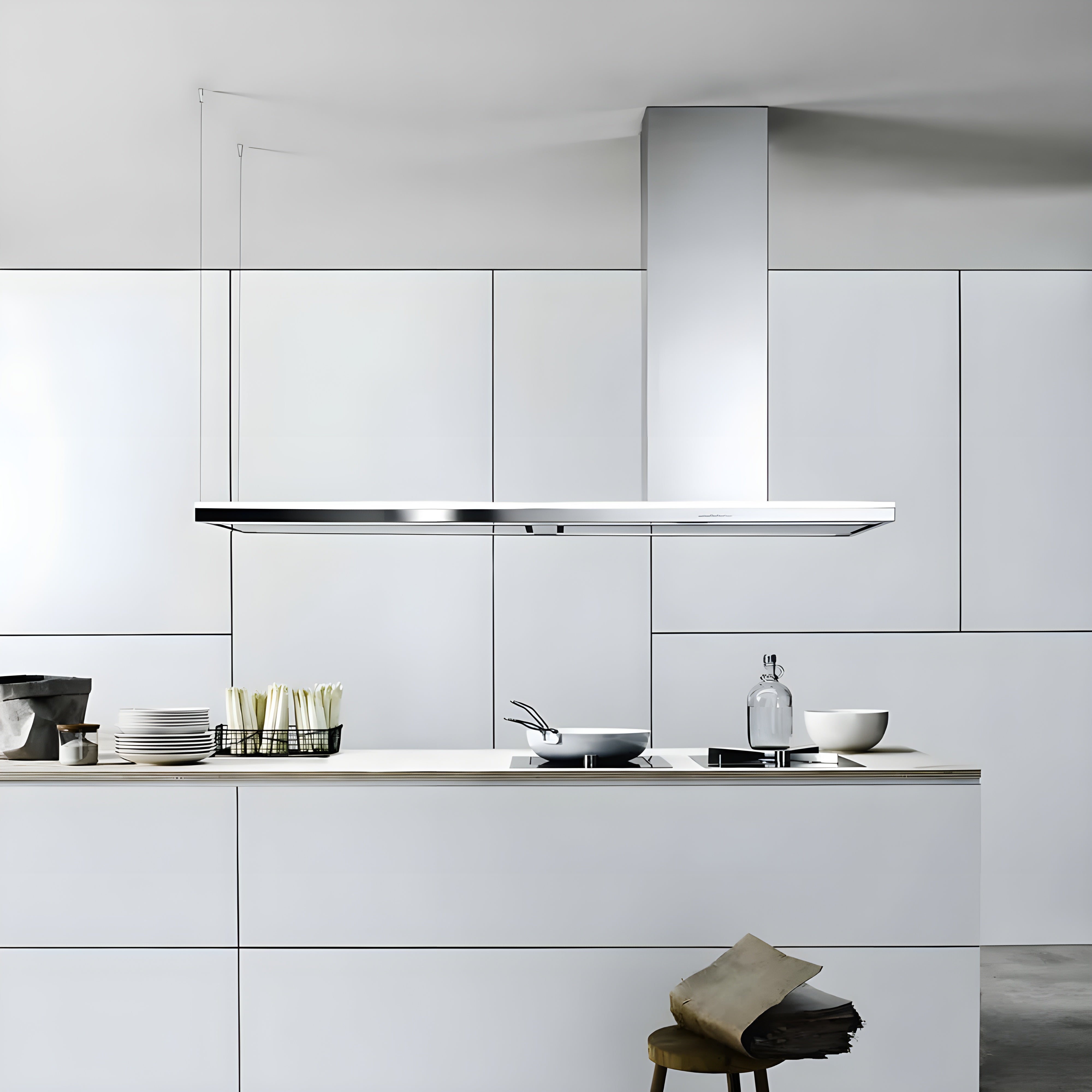 A: It’s island-mounted, specifically designed to overhang centrally located cooktops or kitchen islands.