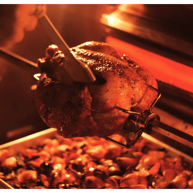 A: Its advanced design, rotisserie capability, and consistent heat distribution ensure professional-grade results.