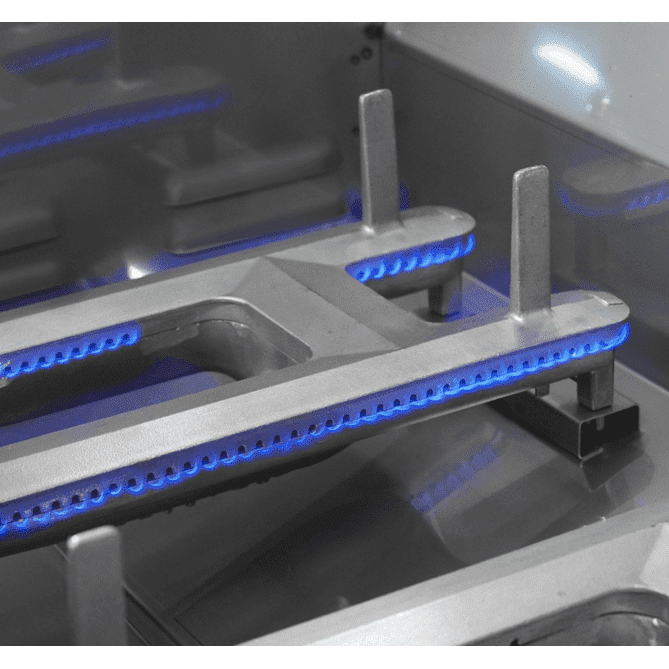 An adjustable warming rack also sits above the cooking surface on either side, for a little extra space to keep food hot while waiting for the rest to cook. Generating heat on the gas side are two cast stainless steel E-burners, with 1/4-inch thick walls and precision porting that combine for 50,000 BTUs. Reliable hot surface ignition always lights your burners where others might fail.