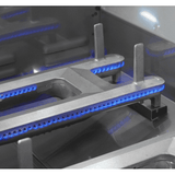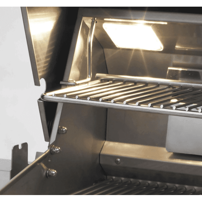 Flash tubes serve as a backup. Flavor grids sit above the burners to spread heat evenly and protect the burners from debris and grease. For nighttime grilling, the interior of the gas side of the grill is lit by two halogen lights. A disposable drip tray system makes cleanup a breeze and reduces the chance of grease flareups. Solid, raised hangers line the sides and back of the grill for a seamless look when placed into a countertop or island.