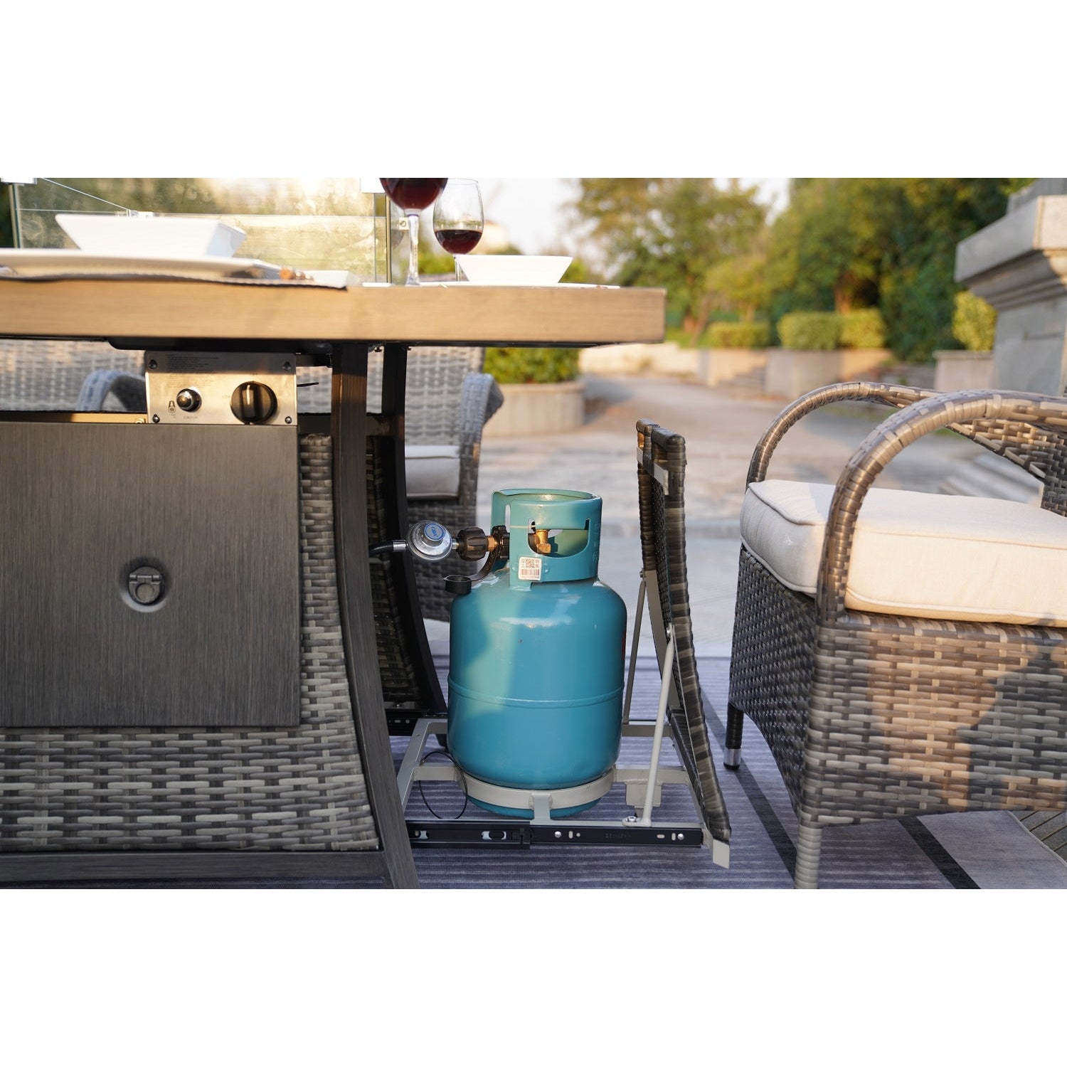 - Fire Pit Table: Integrated propane fire pit adds warmth and ambiance to outdoor gatherings.