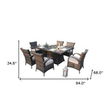 The HomeRoots Outdoors ELLE Gray 7-Piece Wicker Outdoor Dining Set with Fire Pit Table is a luxurious and multifunctional choice for outdoor entertaining. Here’s what makes it exceptional: