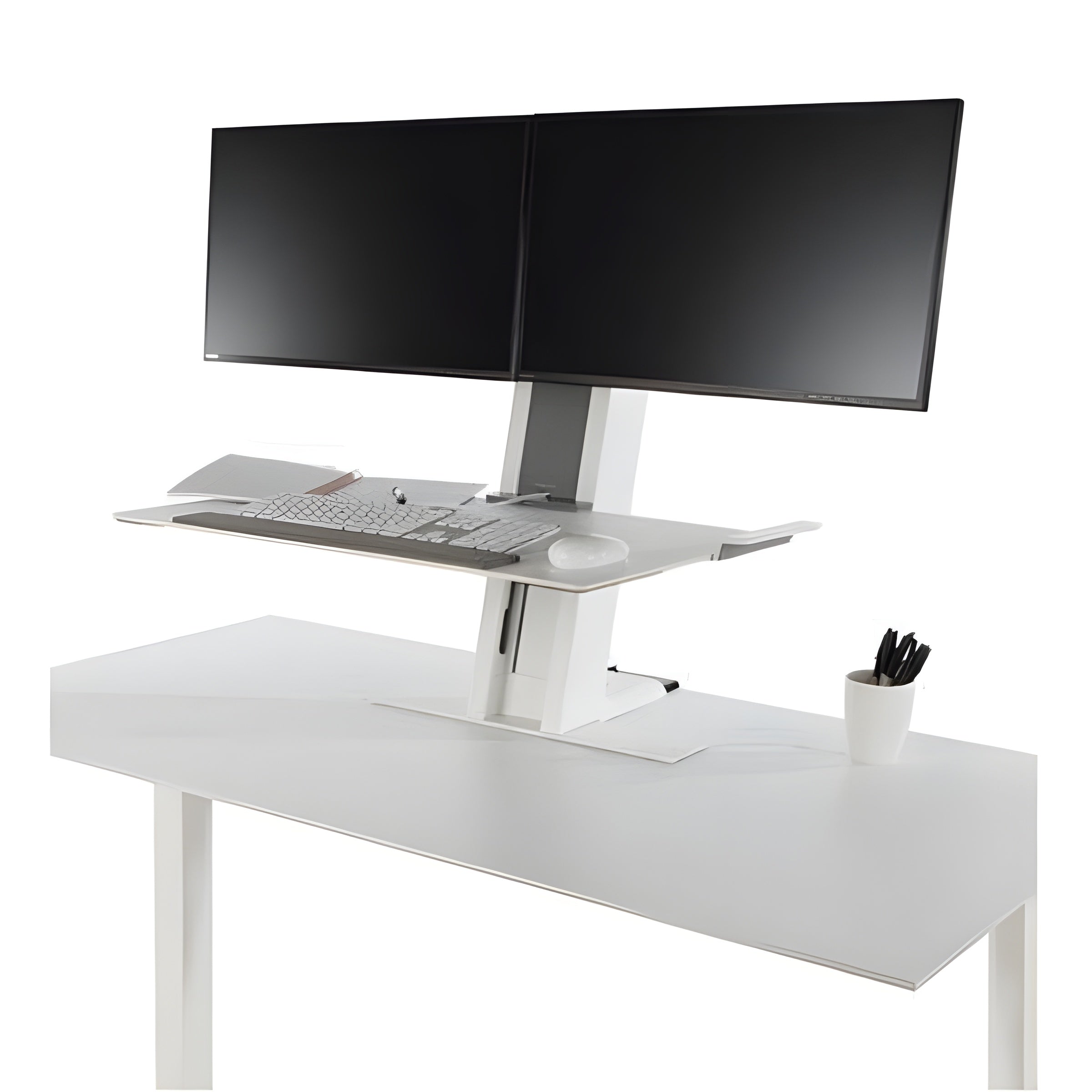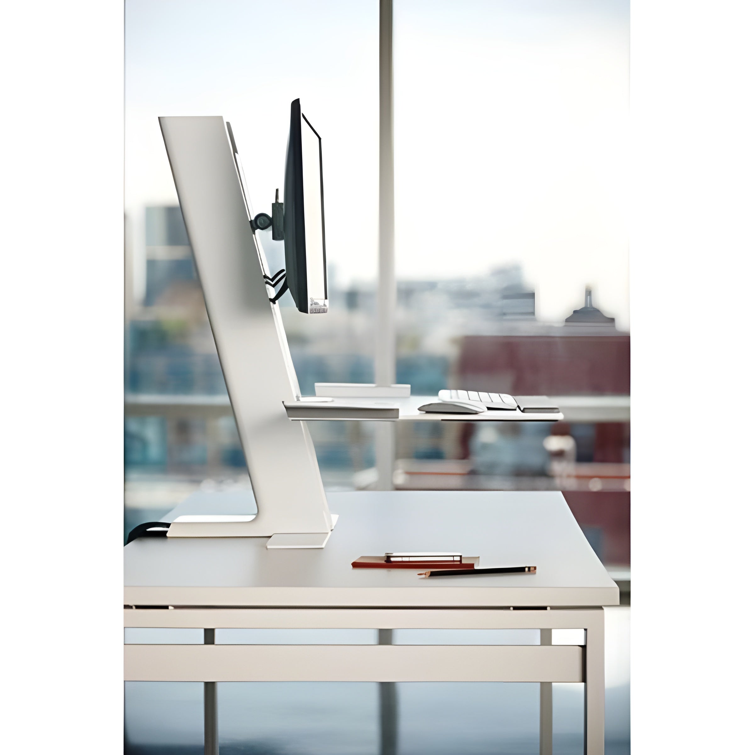 The Humanscale QuickStand Standing Desk Converter is an intelligent rethink of how a sit to stand desktop converter should work, utilizing a "column-style" sit/stand design for smooth and space saving height adjustability.