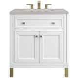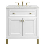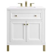 The Chicago collection's sophisticated, subtle details and clean lines make this the perfect choice for any bathroom space. Crafted from Poplar solids and plywood, the Chicago 30" Single Vanity is designed for beauty and function, offering ample storage with an upper tip-out style drawer and double doors opening up to an adjustable shelf. The Champagne Brass finish on the legs and decorative knobs adds a contemporary touch. Choose to forego the metal legs for a modern wall-mounted option.