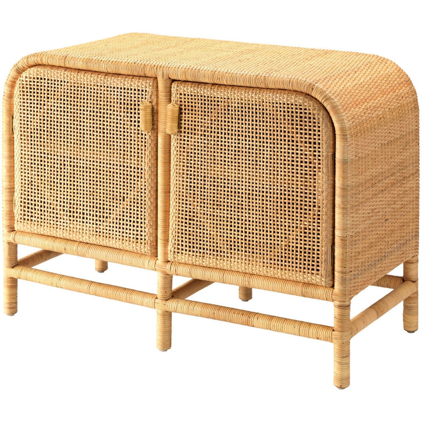 A: A stylish two-door cabinet featuring a natural cane inlay design with a warm wood finish, blending coastal and contemporary aesthetics.