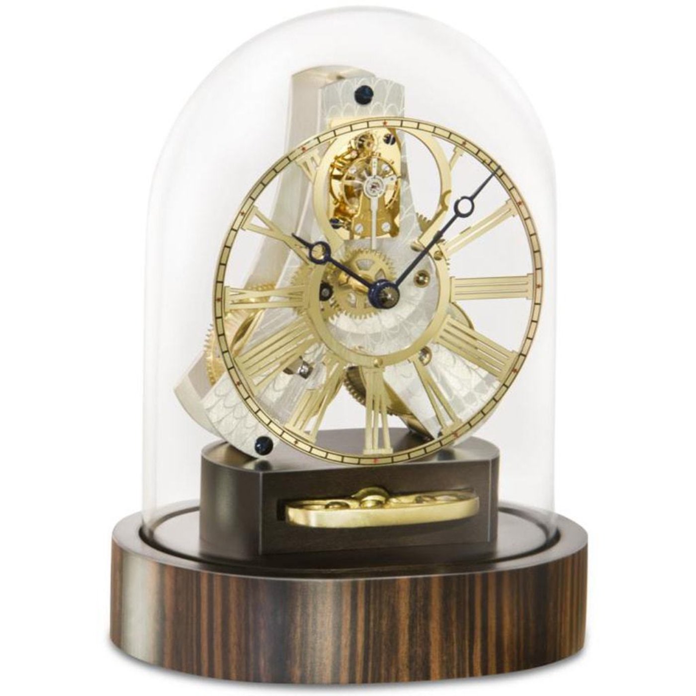 A: The clock showcases a precision-crafted mechanical movement displayed under a crystal-clear glass dome, paired with a richly grained Macassar wood base for a modern yet timeless aesthetic.
