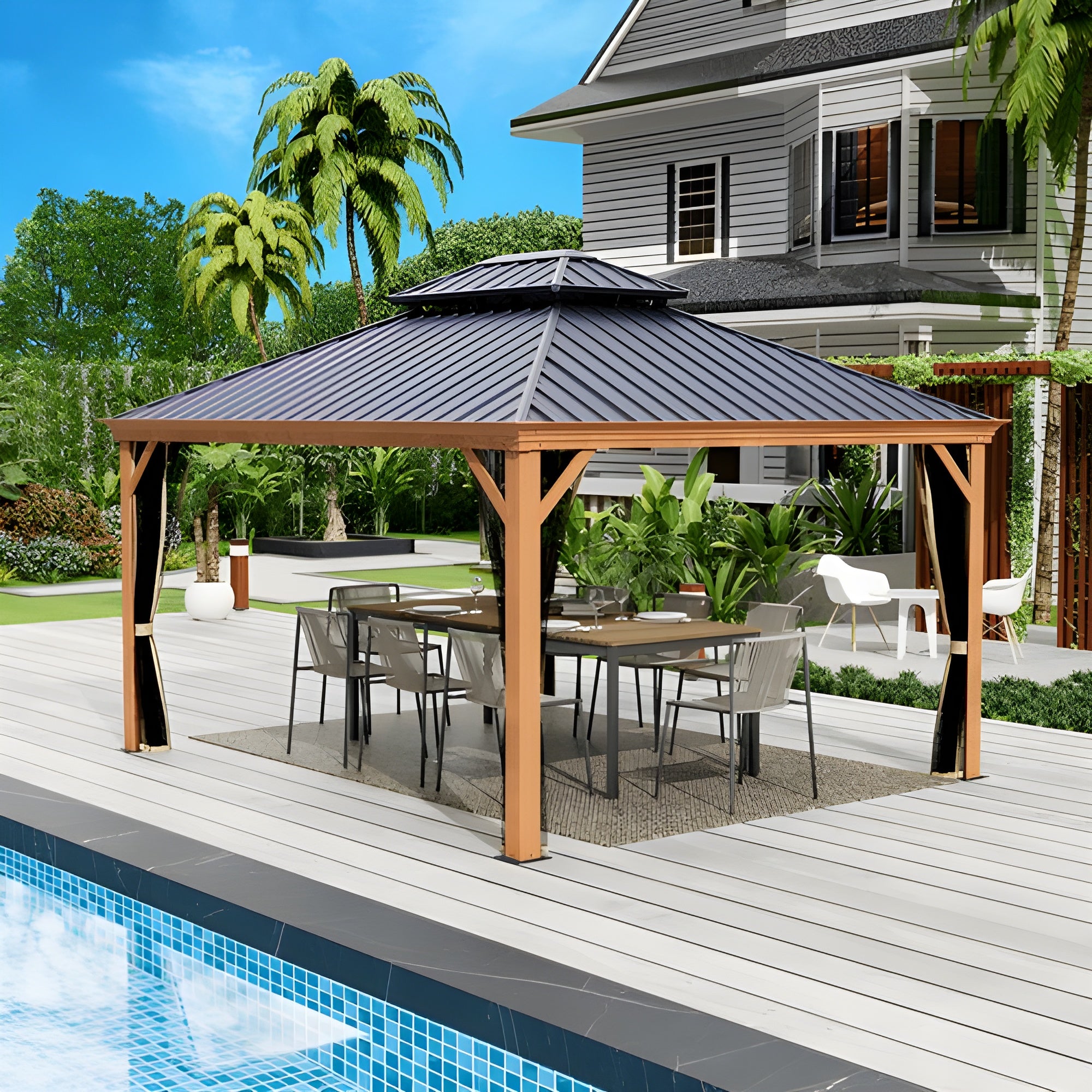 The Kozyard Apollo gazebo features a robust construction with 4.7” x 4.7” triangular poles and 5” x 4” beams. This strong framework ensures exceptional stability and longevity. The galvanized steel roof, combined with the sturdy metal and aluminum frame, provides unparalleled support, capable of withstanding snow loads up to 2500 lbs and wind speeds up to 40 MPH. This durable design ensures your gazebo remains a reliable outdoor retreat for years to come.