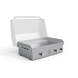 A: It has two high-output gas burners for even heat distribution, a durable stainless steel body, and a large 30-inch cooking surface ideal for cooking multiple items at once.