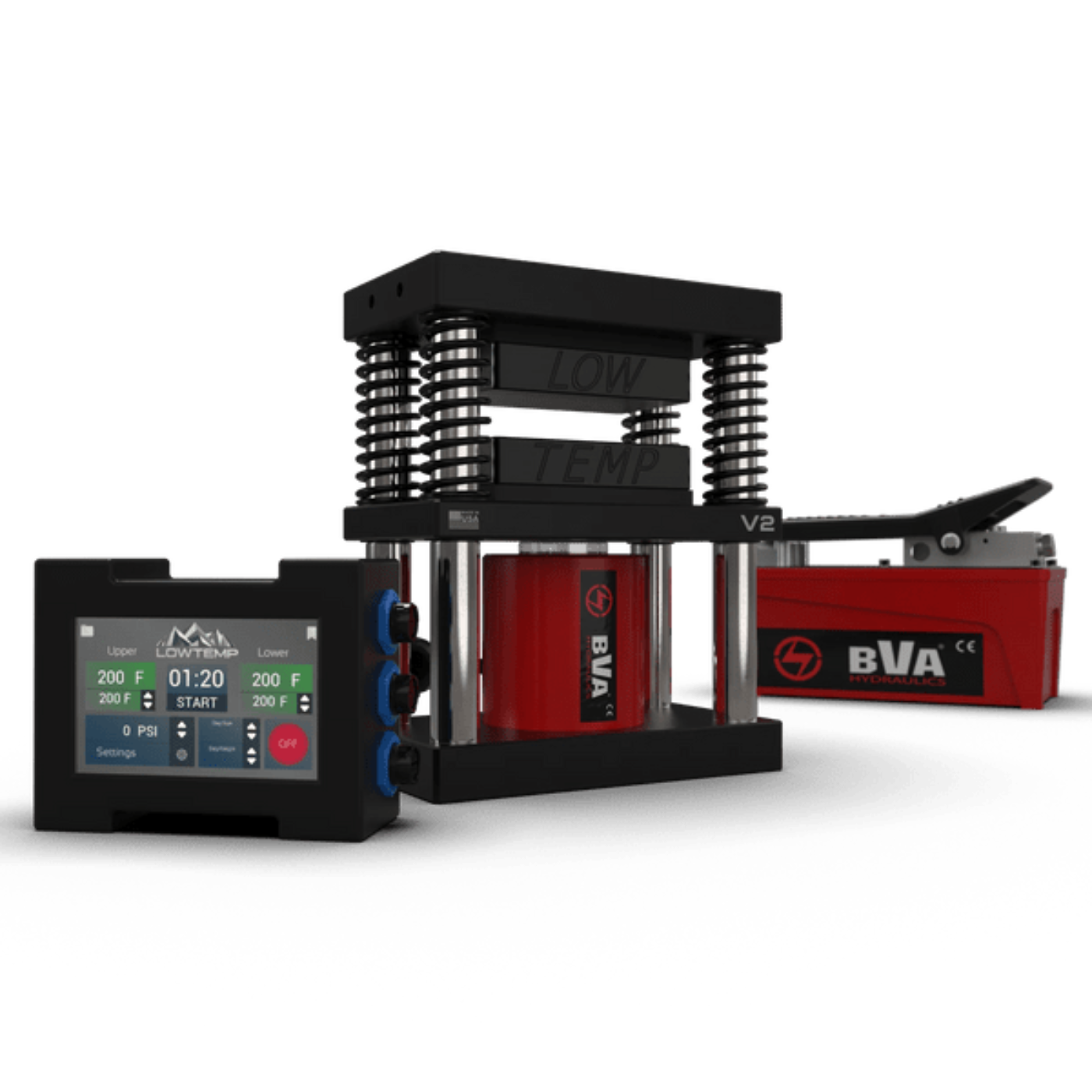 Unlock the finest extracts with the unparalleled precision and durability of the Lowtemp V2 3 x 5 Rosin Press. With its compact dimensions of 10 inches tall, 7 inches long, and 5 inches wide, this rosin press can exert up to 20 tons of pressure, making it a fusion of efficiency and robustness. You can press right out of the box with a hydraulic bottle jack or use the proprietary BVA hydraulic system.