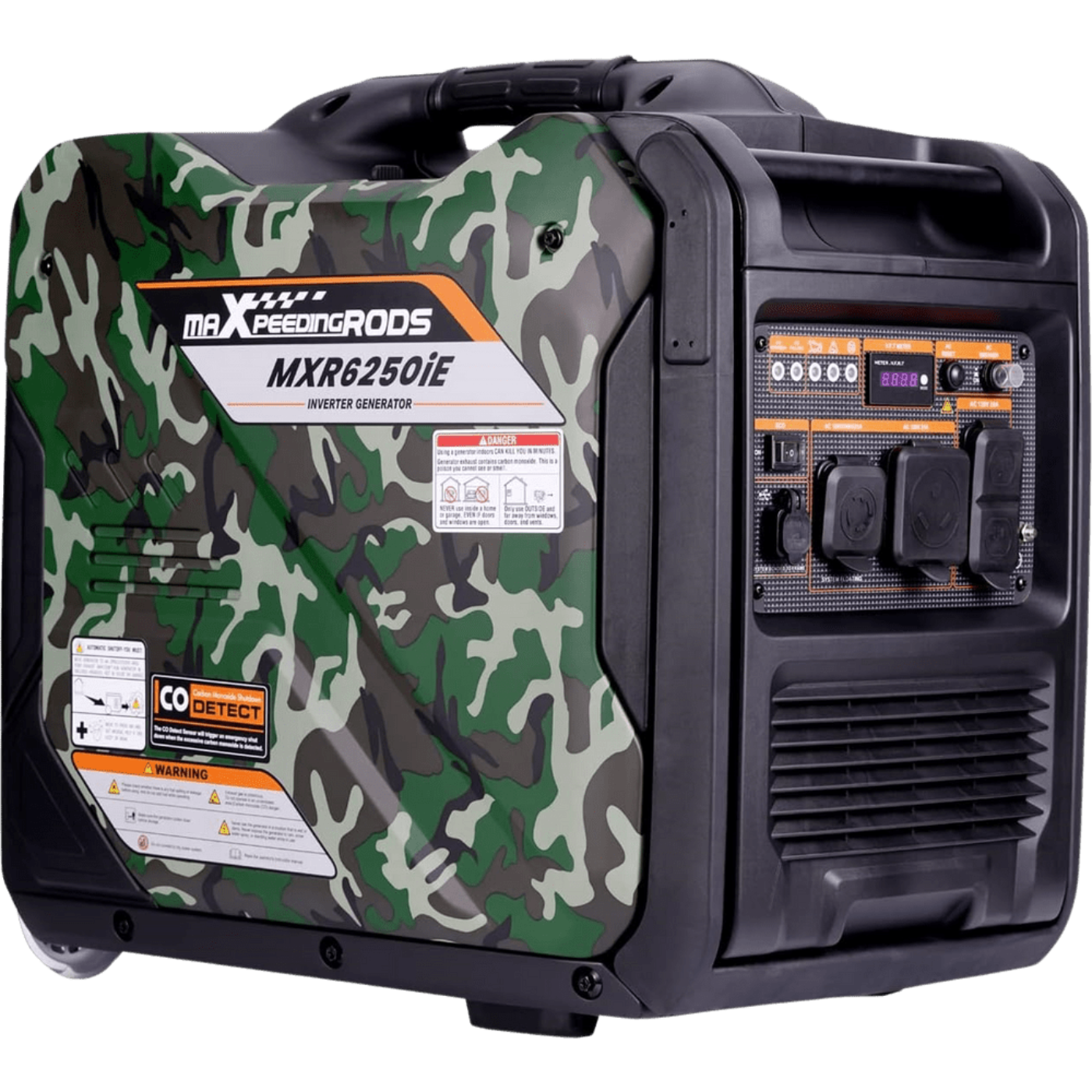 The Maxpeedingrods MXR6250IE-CA Portable Gas Inverter Generator provides 5000W with a maximum of 5500W super-quiet operation at just 68 dB. Featuring a compact design with wheels for easy transportation and carrying. Reliable, clean power perfect use for camping to jobsites and power failure in extreme weather.