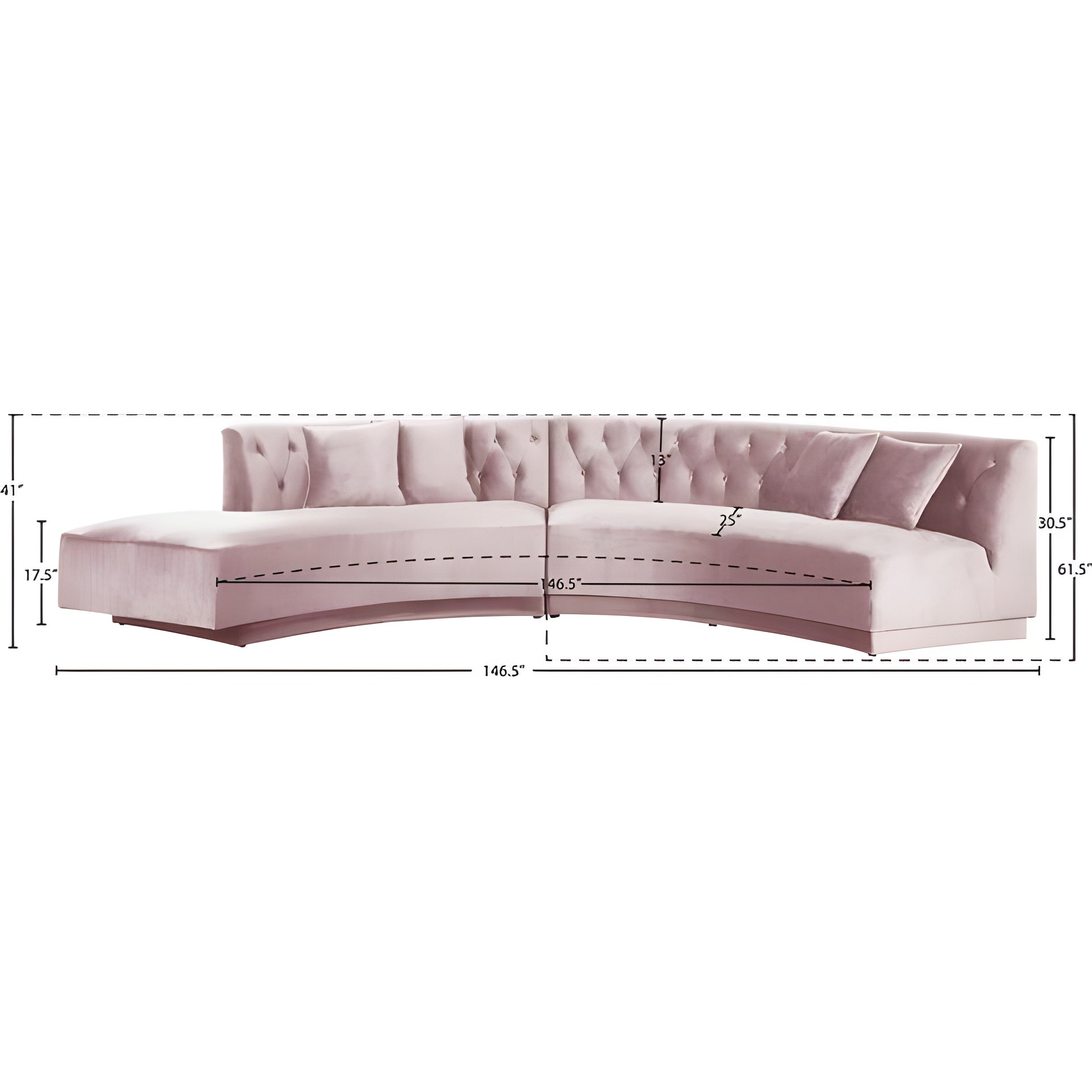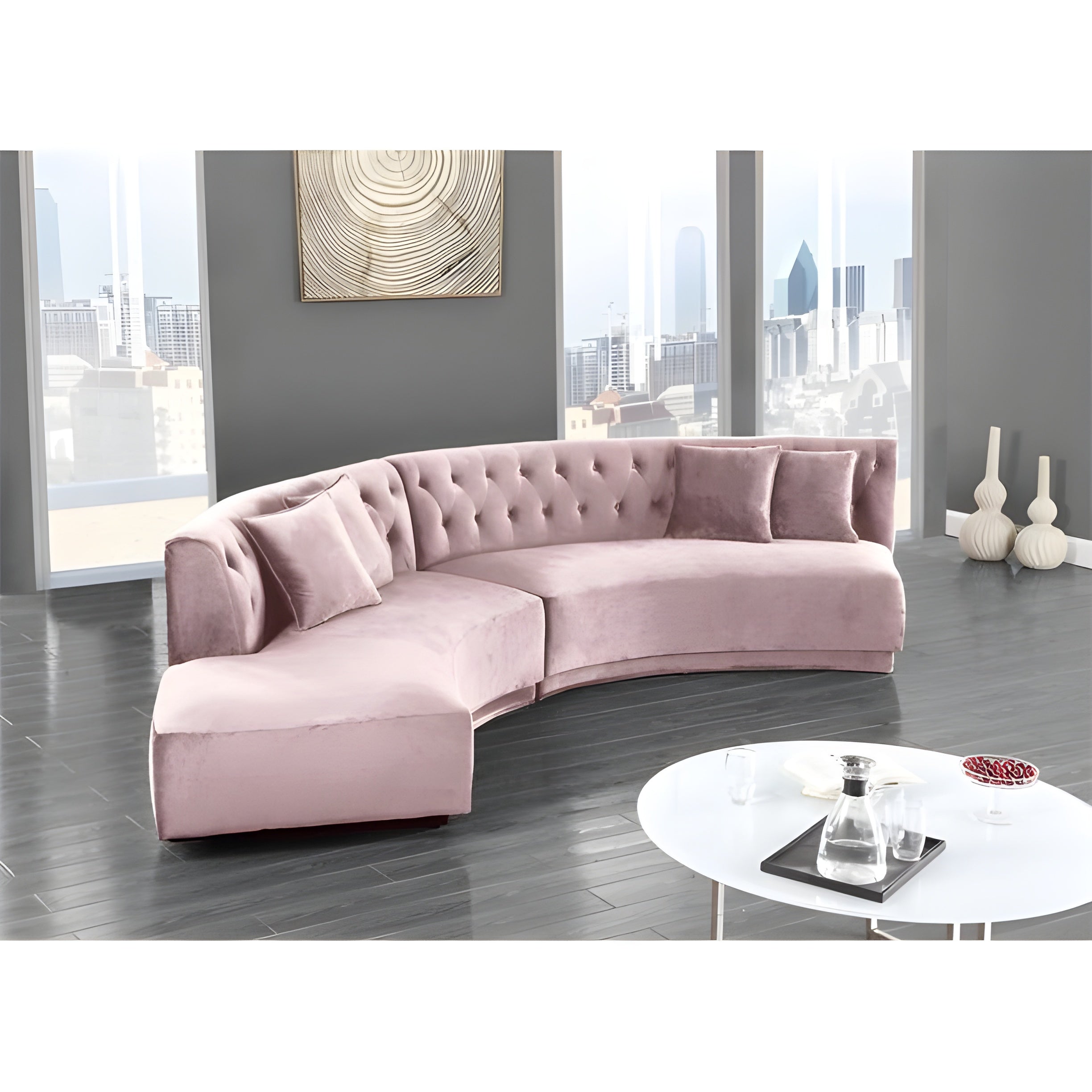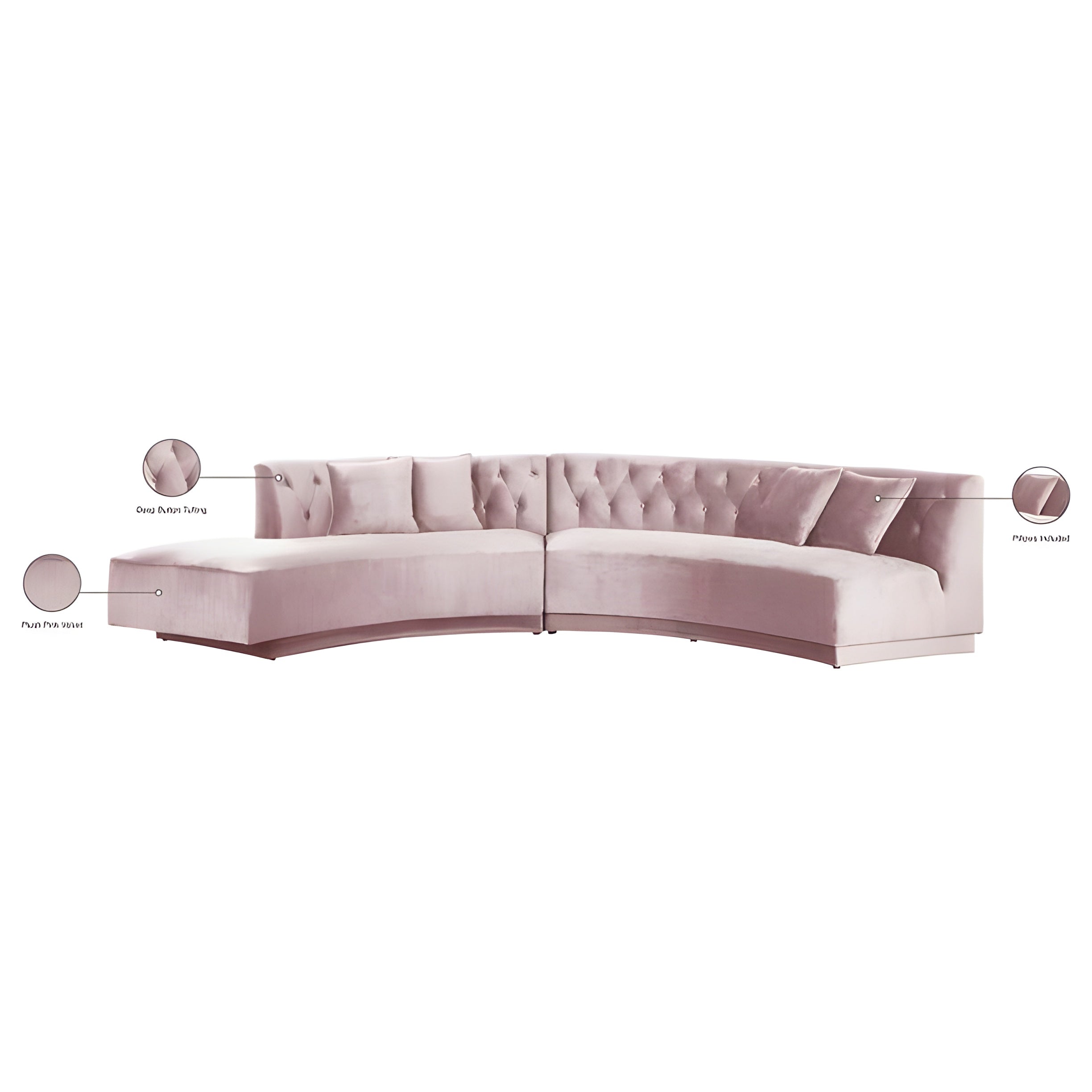 Kick back and prepare to get comfy with this plush pink velvet Kenzi two-piece sectional. This curved sectional provides ample space for you to spread out and take a luxurious nap, or cuddle up with your whole clan and watch a movie in the evening. Deep button tufting adds texture to its plush pink velvet upholstery, and its contemporary design makes this a sectional sofa the perfect focal point for any modern living room.