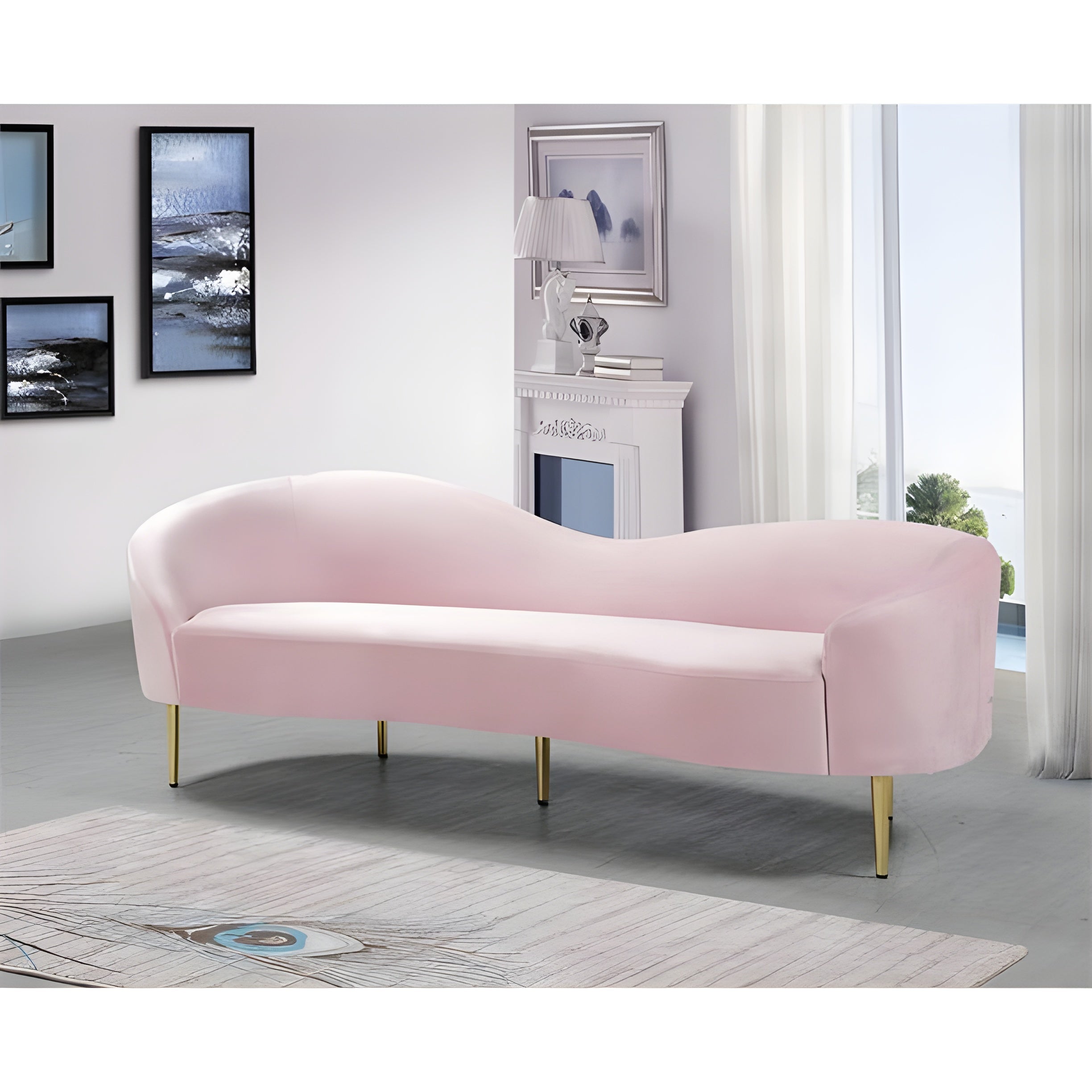 Get comfy while remaining chic in this elegant RitzVelvet Sofa in Pink. Plush pink-colored upholstery provides a soft texture that is pleasing to the senses, while its curved design offers a contemporary touch to your home furnishing. Gold metal legs complement the sofa’s sophisticated pink color, creating a gallant piece anyone would be proud to display in their home.