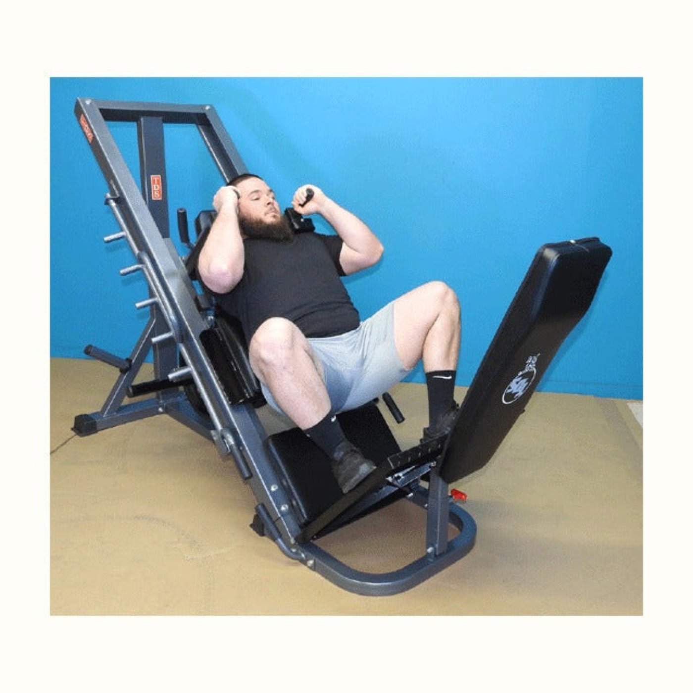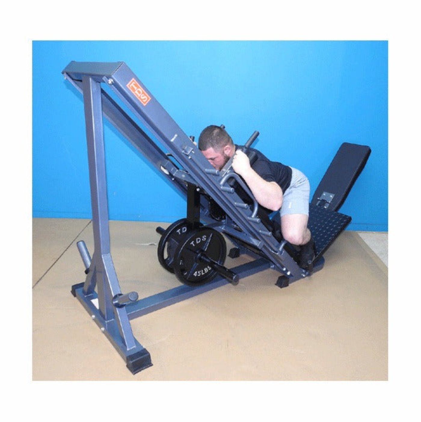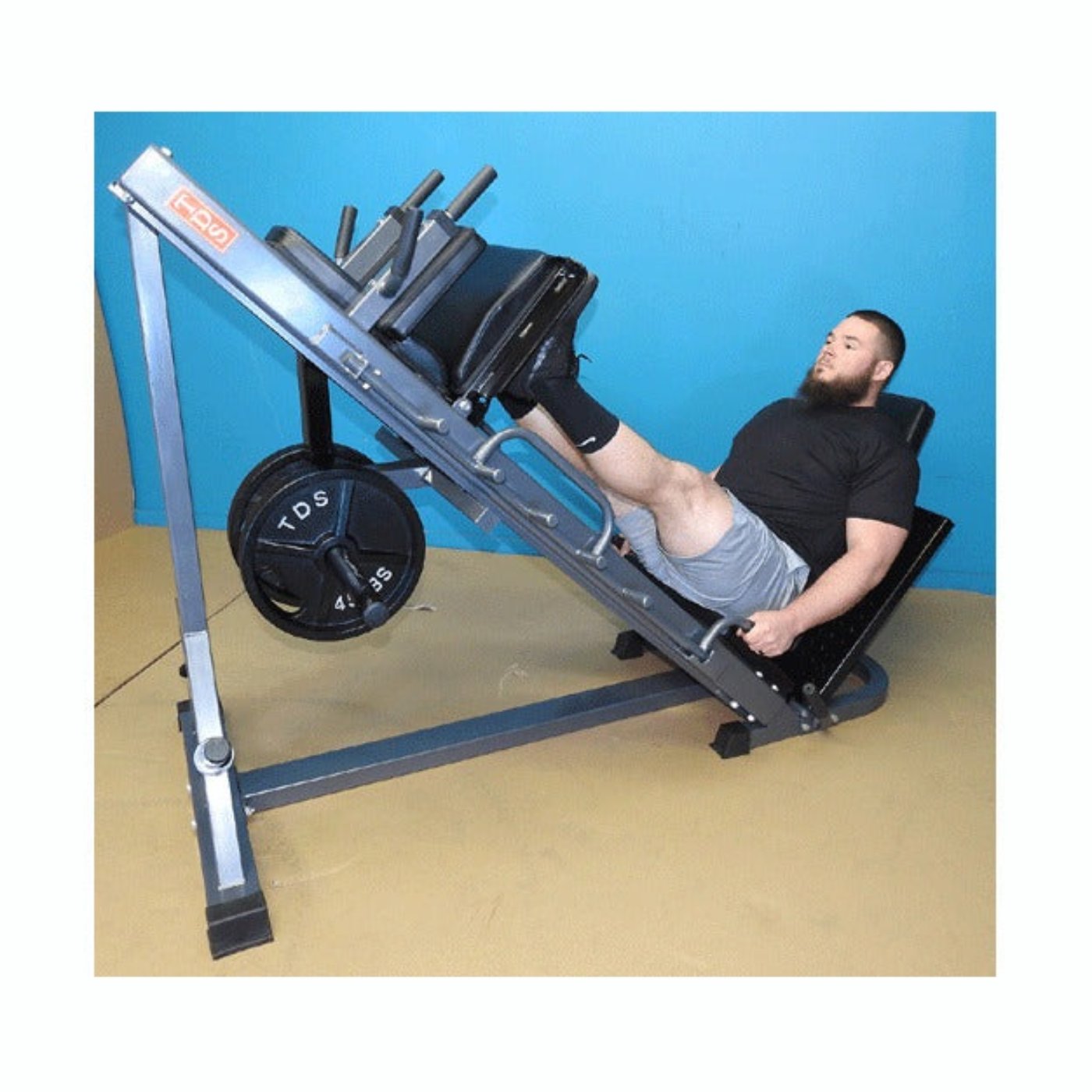 A: A versatile piece of gym equipment designed for leg presses and hack squats, providing a high-intensity lower body workout with adjustable settings for comfort and safety.