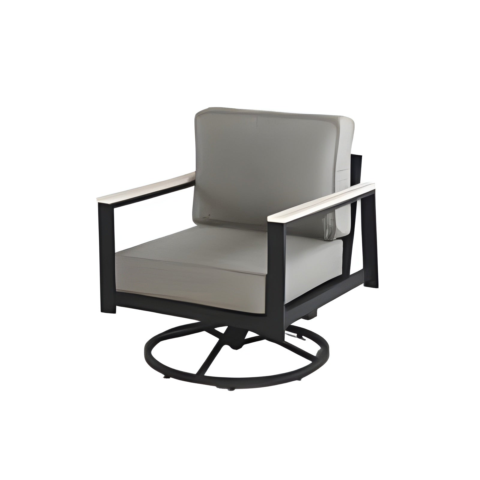 Experience modern style and exceptional versatility with the North Cape Hixon Swivel Rocker from North Cape International. This outdoor patio rocking chair blends Tangent PolyTuf™ Lumber arms with a powder-coated aluminum frame, offering a contemporary aesthetic with enduring elegance.