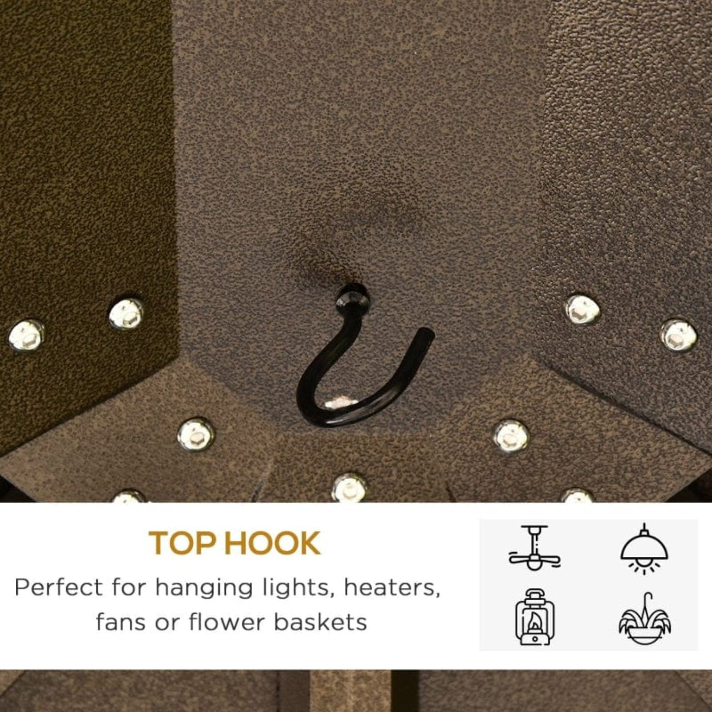 Looking for a lightweight outdoor option for your garden party or pool plan? Outsunny has a hard-top gazebo 10 x 12 that can. Stop sunburns by blocking UV and ease your eyes with its galvanized steel roof. Use zipped mesh nettings and privacy curtains to master the elements. The party doesn't end at sundown; hang lights, lanterns, or decorations from the two ceiling hooks. Keep your plans firmly planted on any surface with support stakes for soft ground and easy-to-carry aluminum metal framing.