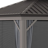 A: This gazebo is built with a powder-coated steel frame and a rust-resistant galvanized steel hardtop roof, ensuring durability and protection from the elements.