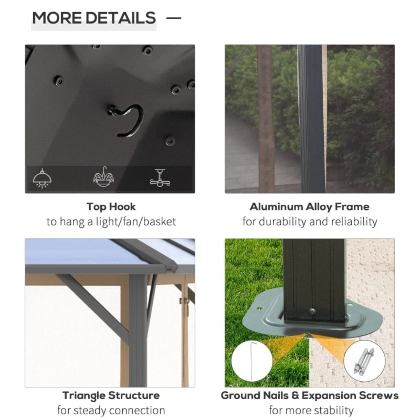 Want to sit in the summer sun but don't want to get burned? Outsunny has a tinted patio gazebo to let you love your time outside. Made with a polycarbonate roof, this gazebo blocks UV while still letting the sun shine through. It also features four zip-on mesh netting sidewalls you can use to keep winged worries away. Made of easy-to-assemble aluminum reinforced with strong steel support structure, you get the best of both. Be comfortable in your backyard with Outsunny.