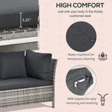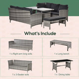 4 PIECE SET: This rattan wicker patio furniture set includes one right-arm long sofa, one 3-seater sofa, one dining table, and one long bench. These can be arranged in various configurations to fit your outdoor space.