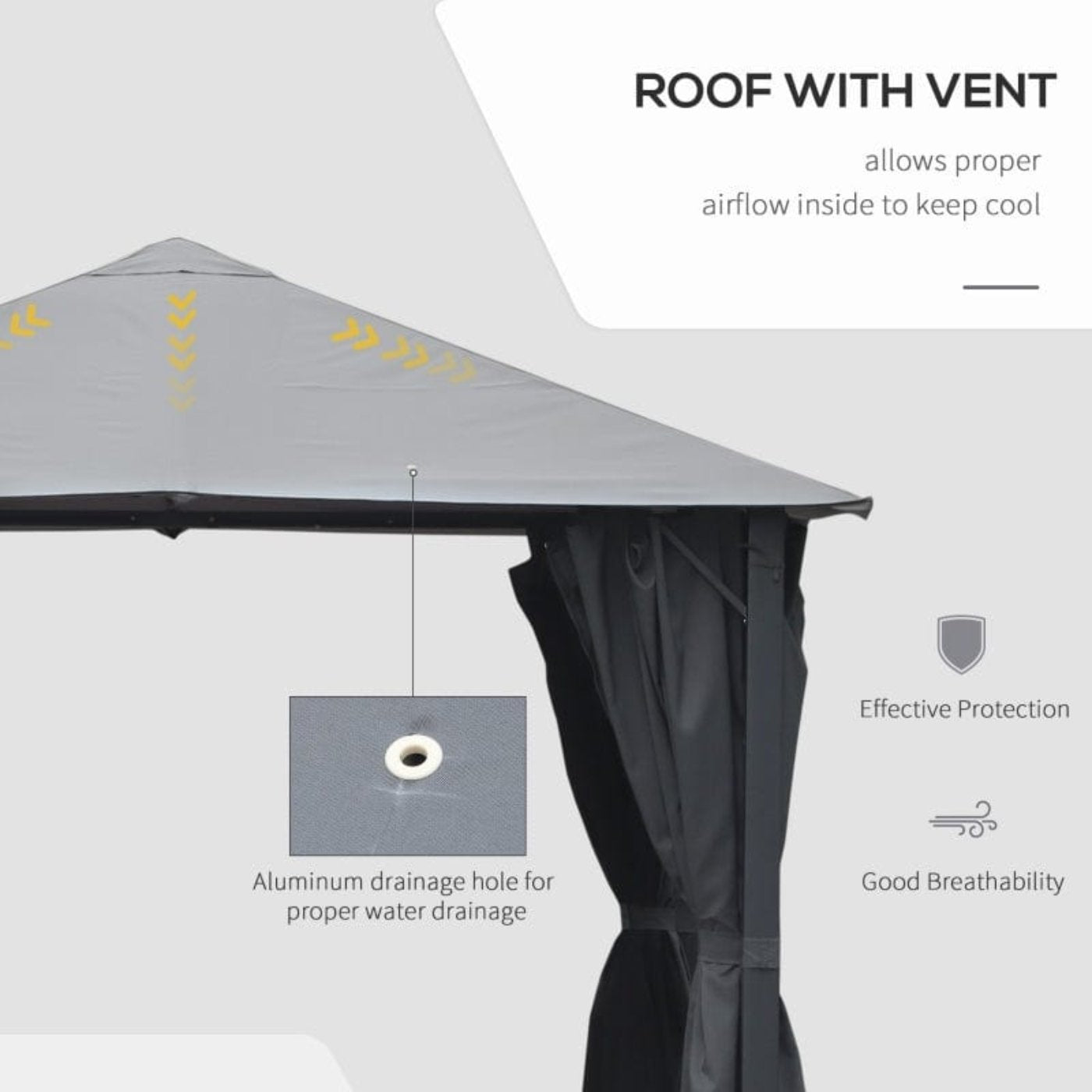 PRACTICAL CANOPY TOP: This deck gazebo has a durable polyester fabric roof with a PA coating, giving it water and UV fighting property and providing a full range of protection from light rain to sunny days. The built-in grommets throughout the fabric help ensure proper water drainage.