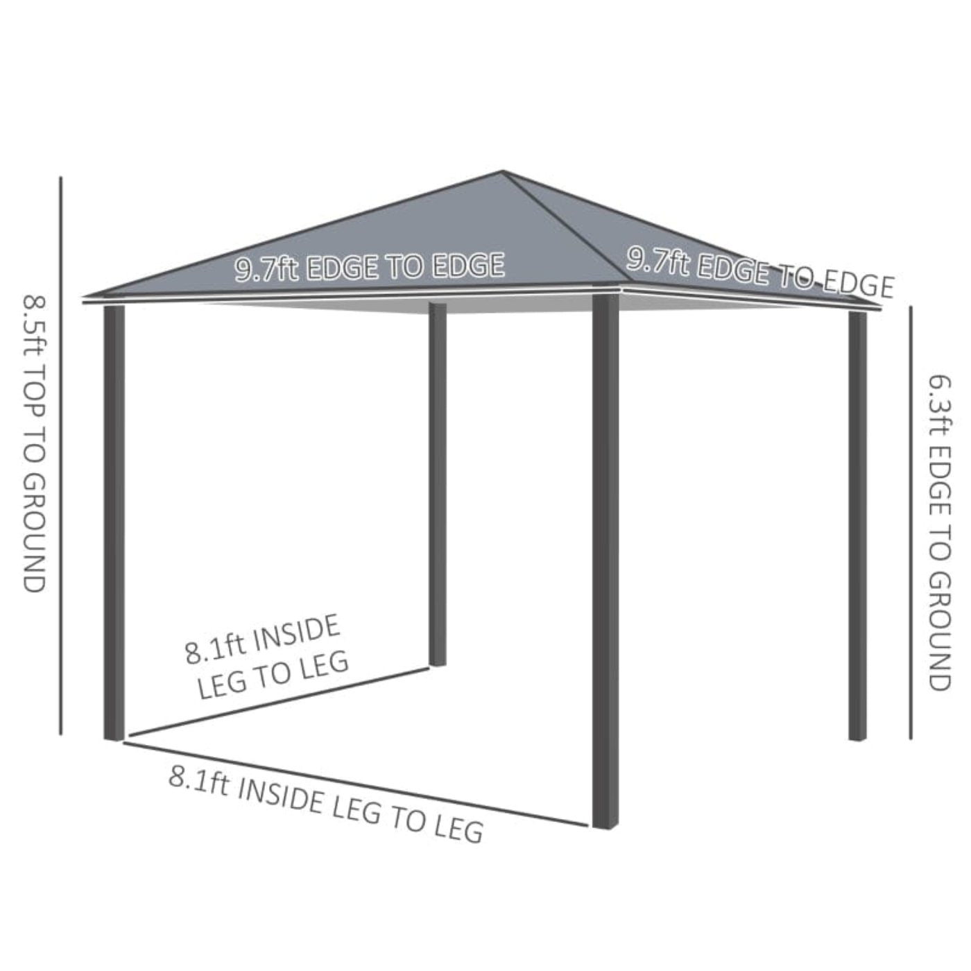 BACKYARD GAZEBO DIMENSIONS: Overall Size: 9.7'L x 9.7'W, Eave Height: 6.3', Top Height: 8.5'. Distance between columns: 8.1'. Assembly required.