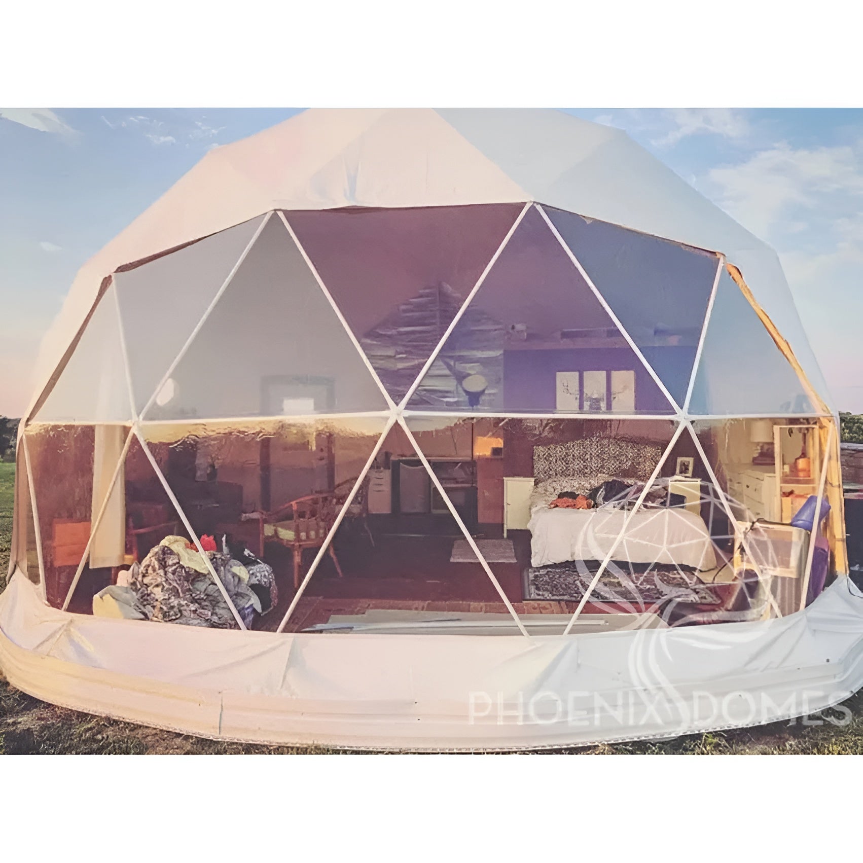 Upgrade your outdoor adventures with the Phoenix Domes 4-Season DELUXE Glamping Package Dome. Designed for year-round use, this glamping dome offers a blend of luxury, functionality, and durability. Perfect for those who seek the ultimate glamping experience, this 16-foot dome provides a spacious and comfortable retreat in nature.