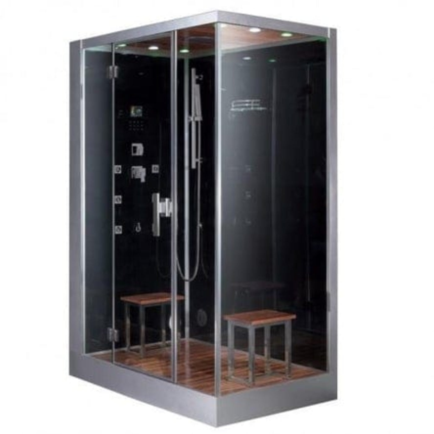 The Platinum DZ961F8 walk in steam shower is 59"x 35"x 89". Featuring an upgraded 6KW high efficiency steam generator, 6 acupressure body jets, and LED chromatherapy, the DZ961F8 invites you to indulge yourself in a state of complete relaxation and tranquility. The wooden ceiling and floor combined with chrome trim add immediate distinction to any bathroom. Also available in a right-side configuration.