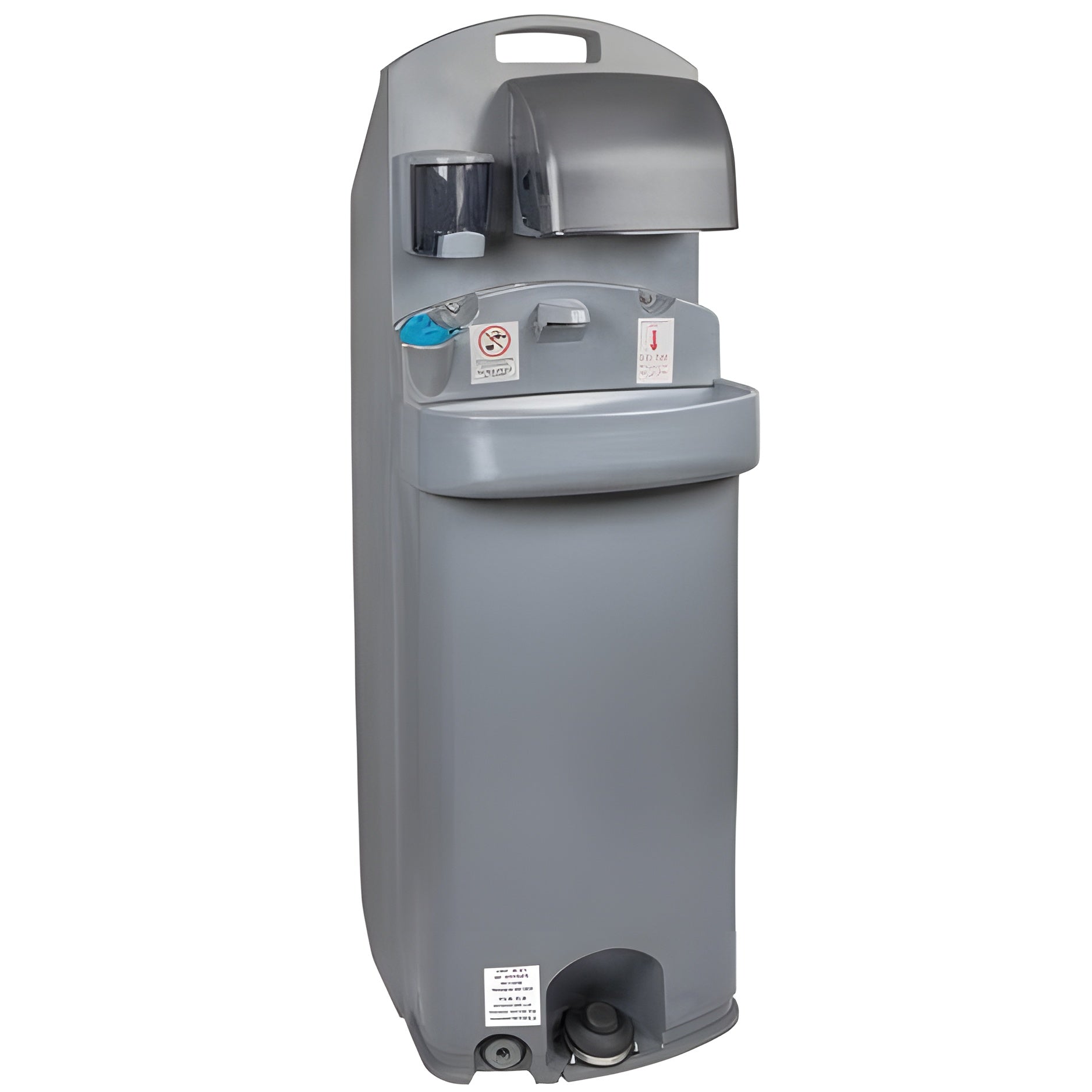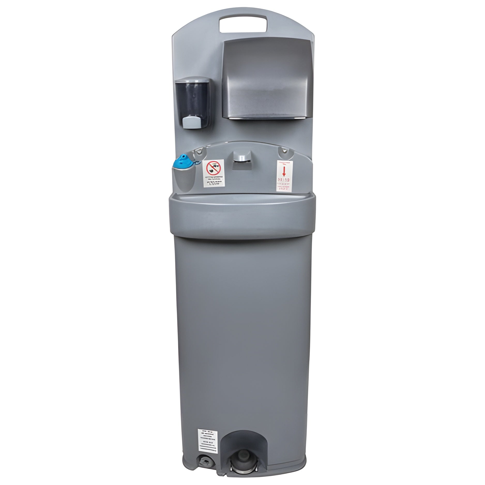 Use the PolyJohn PSW3-1000 Encore gray 15.5 gallon mobile sink to provide guests with a convenient and sanitary way to wash their hands in locations where a restroom is not immediately accessible. This includes food service establishments, offices, classrooms, and a variety of other locations. For optimal portability, the Encore mobile sink features a compact design with built-in handles on the top and the rear, allowing the sink to be tilted like a hand truck and moved by one person, even when it's full of water. The sink's lightweight, non-marking wheels with rubber tread allow it to roll smoothly across a variety of surfaces.