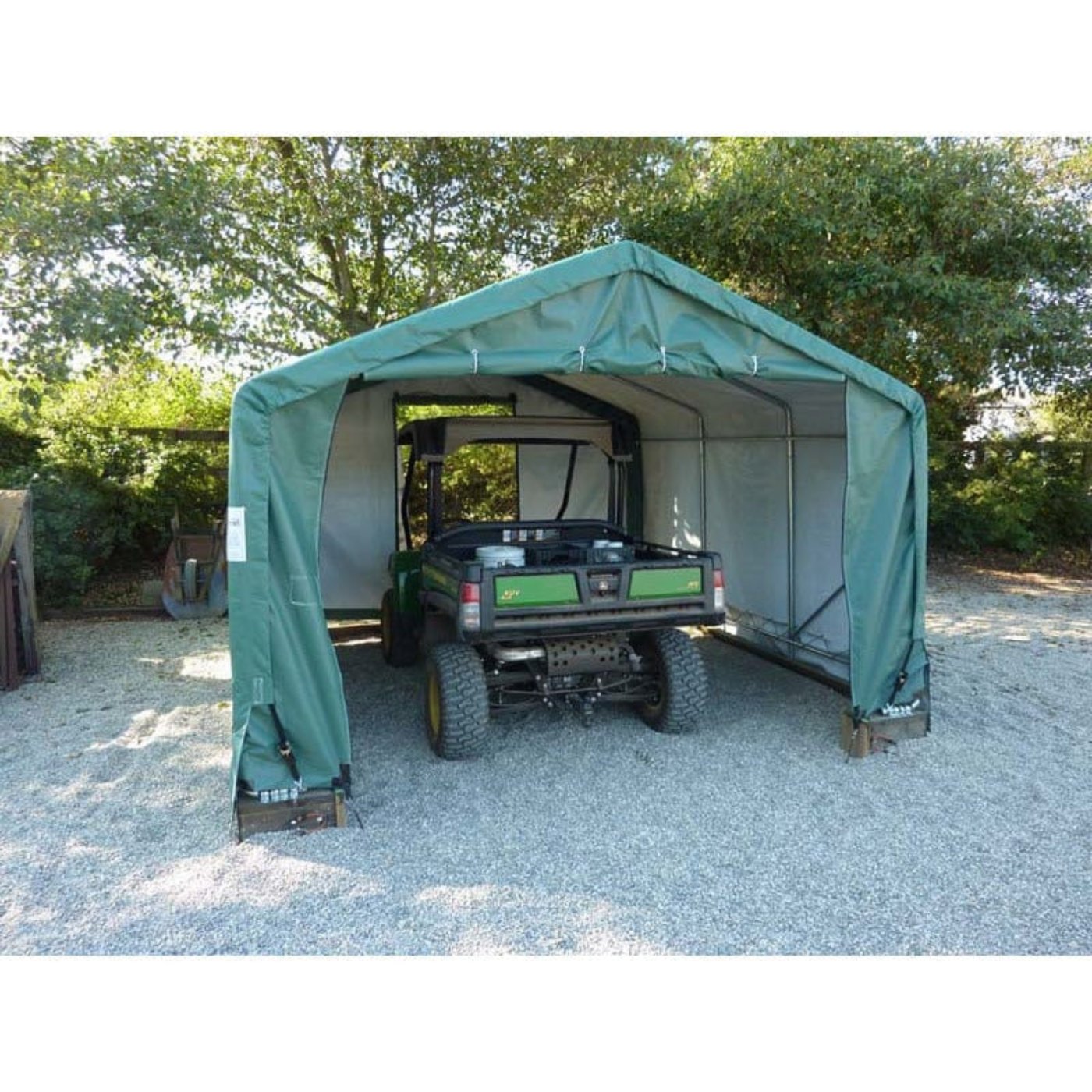 The 10x15x8 is an easy to assemble shed. It can be set up with two people in just about an hour! The double-zipper doors are located on both ends, making it easy to access. It also gives you the option to conveniently drive-thru if you are storing small vehicles!