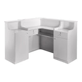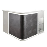 The Smart choice for the reception area has arrived and it is Made 100% in Italy with the world's best quality! This stylish reception desk in white melamine commands attention upon entering the salon, with an upholstered front panel (available in a choice of 47 Italian Sky Colors) that curves at a 90° angle, allowing for the desk to be positioned in different ways, while still being compact enough to create extra space in the reception area. LED lighting beautifully accentuates the form of the Sky-covered panel, while also adding importance to the reception desk. The Smart reception desk complete with a closed storage cabinet and an open retail storage cabinet for great flexibility.