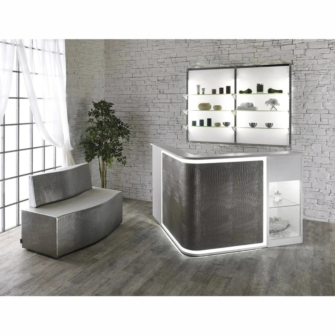 A: It is a modern, stylish reception desk designed for salons, featuring LED lighting and a sleek Italian-inspired design that enhances the reception area.